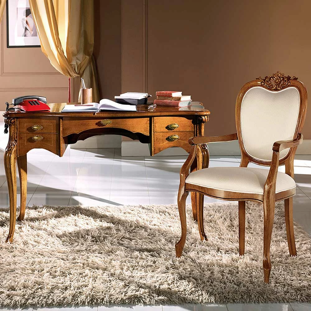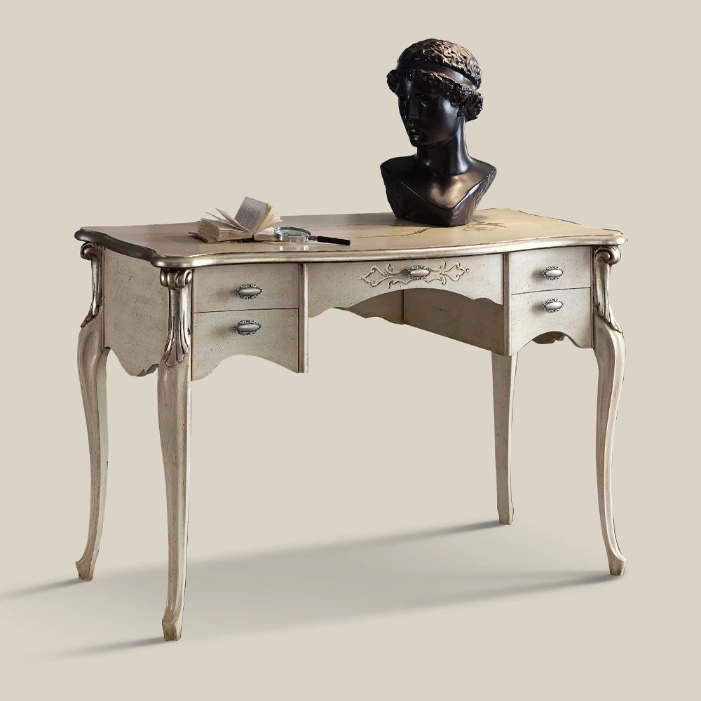 Dit bureau in klassieke stijl is perfect om een woonkamer, studeerkamer of slaapkamer stijlvol en elegant in te richten. Het is gemaakt van hout in Bassano walnoot of antiek witte afwerking en heeft 5 praktische lades. Ook is het mogelijk om te kiezen tussen de uitvoering met de deur die naar rechts of naar links kan worden geopend. Een unieke en verfijnde aanvulling, volledig gemaakt in Italië door bekwame meesters , meesters van kunst die elke aanvulling afwerken met wijsheid en smaak voor elegantie. De productie wordt uitgevoerd met behulp van fijne materialen en het werk wordt met de hand uitgevoerd met de grootste zorg en professionaliteit die Made in Italy- producten onderscheidt.