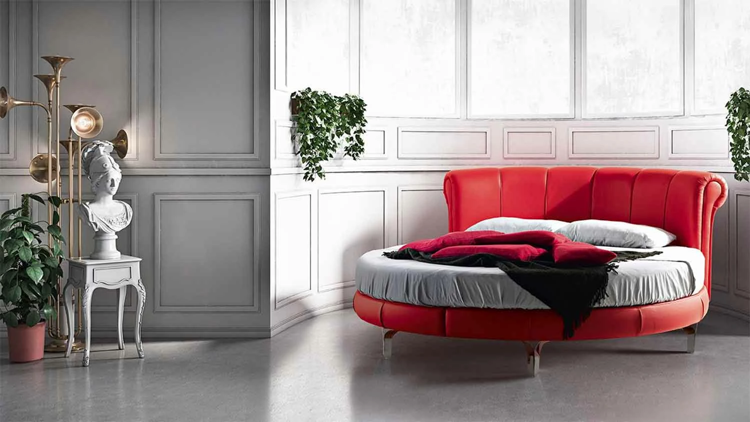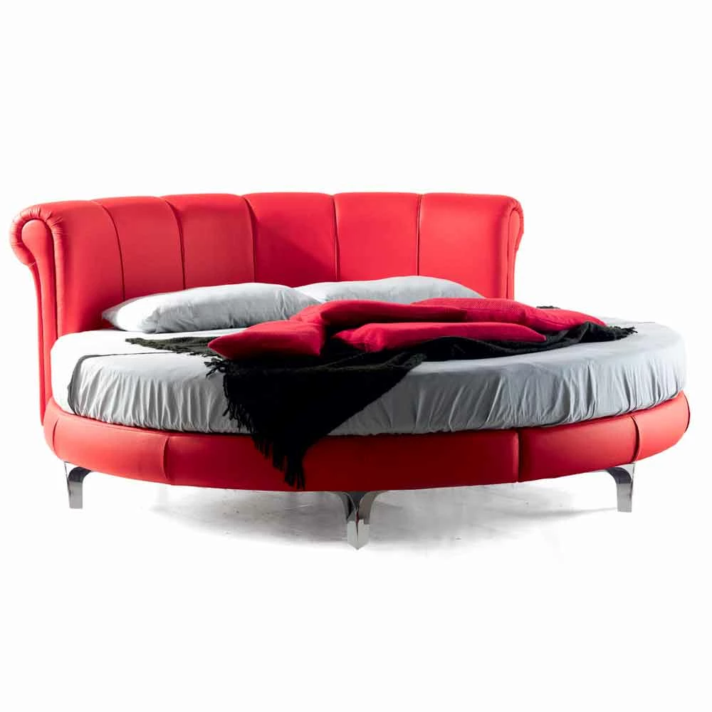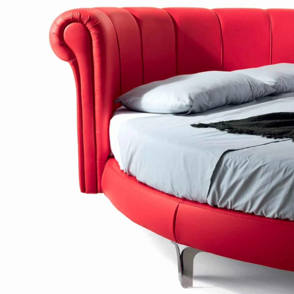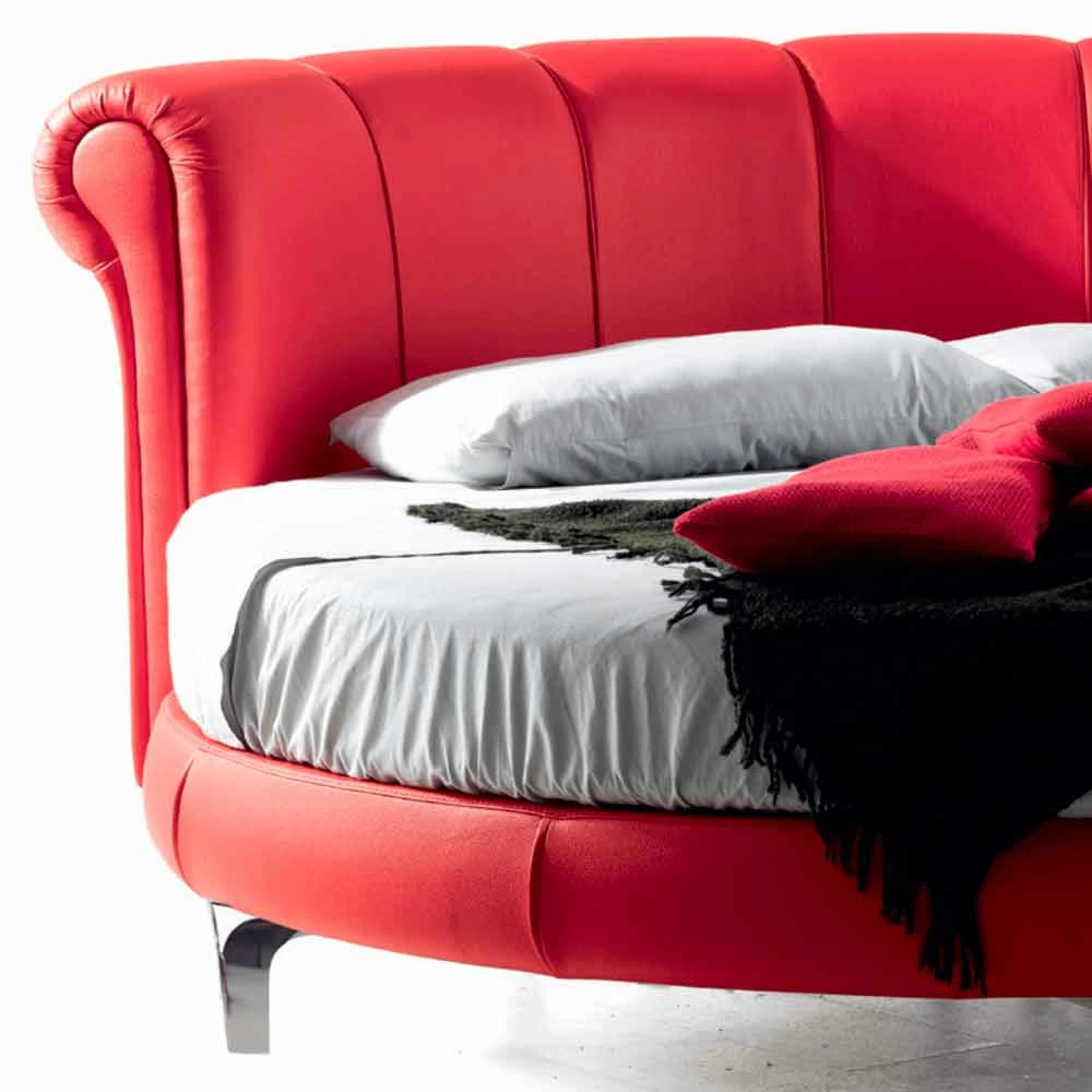 Rond tweepersoonsbed zonder bak gestoffeerd in eco-leer, handgemaakt in Italië.