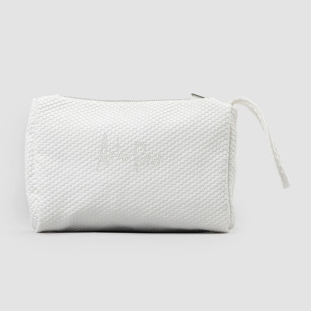De waarde van traditie voegt zich bij de moderne levensstijl met deze natuurlijke witte make-uptas in stof met piqué-effect met een hartvormige decoratie gevormd door aurora borealis of witte strass steentjes.