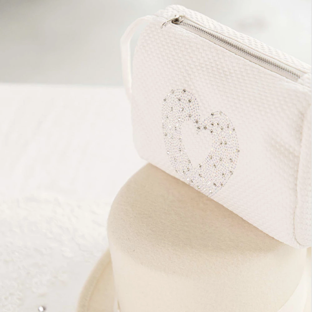 Natuurlijke witte toilettas met strass hartdecoratie, echte luxe gemaakt in Italië.