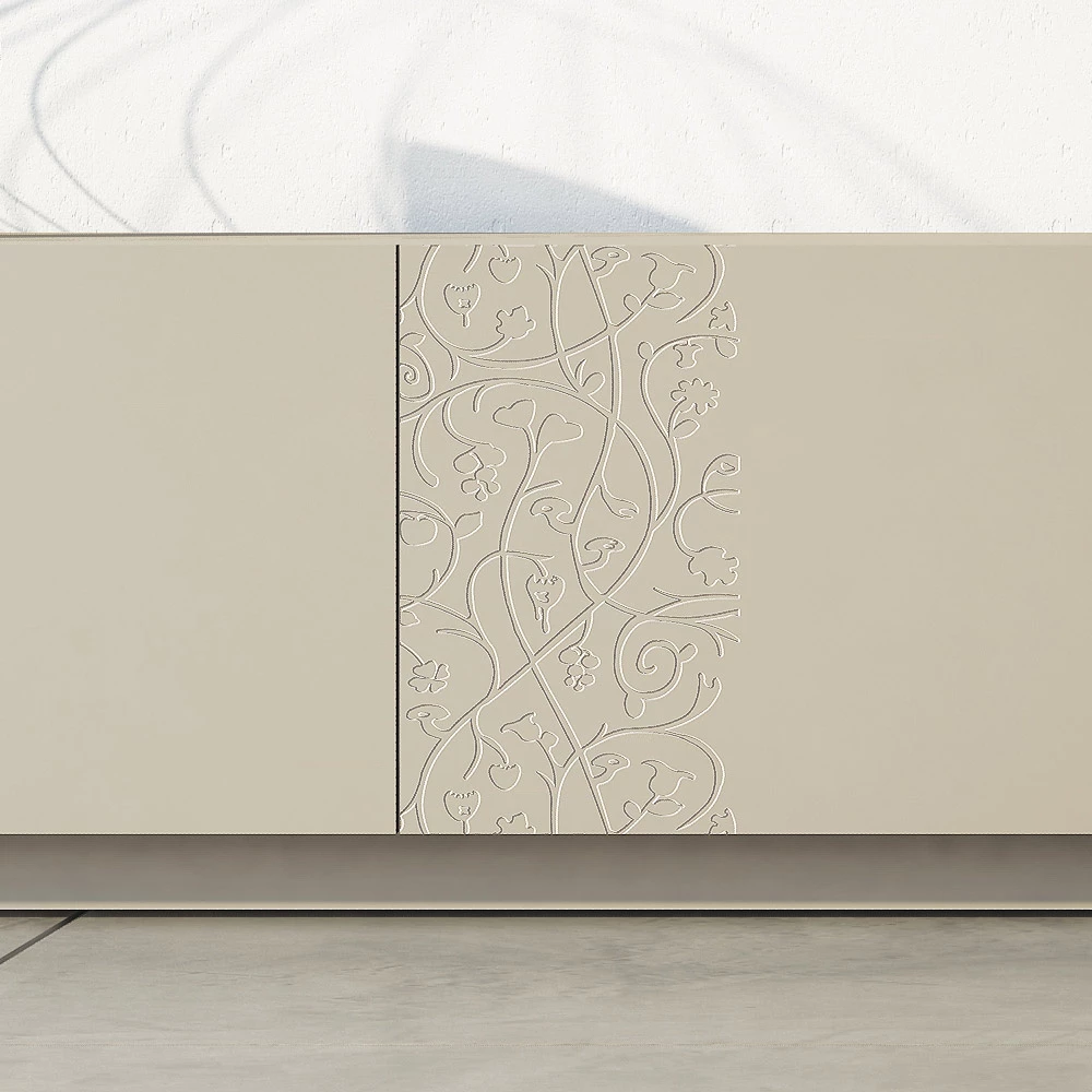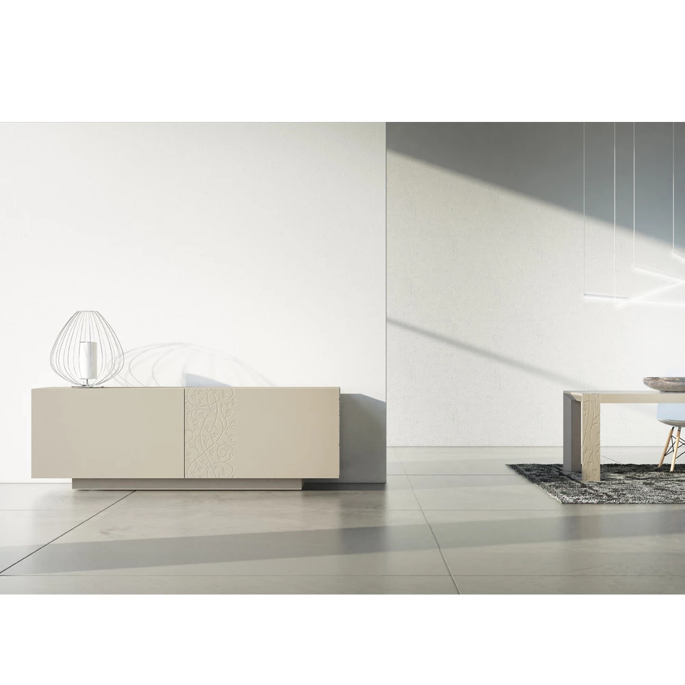 Woonkamerdressoir met alpacagrijs mat gelakte MDF- structuur bestaande uit 2 coplanaire schuifdeuren die een grote functionaliteit en bruikbaarheid garanderen en van de gelakte plint die veel stabiliteit biedt. Dit product zit vol smaak en design dankzij de elegante en verfijnde afwerkingen en de gedeeltelijke bas-reliëfversiering van de deuren, wat het uniek maakt in zijn soort. De verschillende materialen die voor de constructie zijn gebruikt, bieden een hoge kwaliteit en weerstand in de loop van de tijd, waardoor het product een uniek en onvergetelijk tintje krijgt.