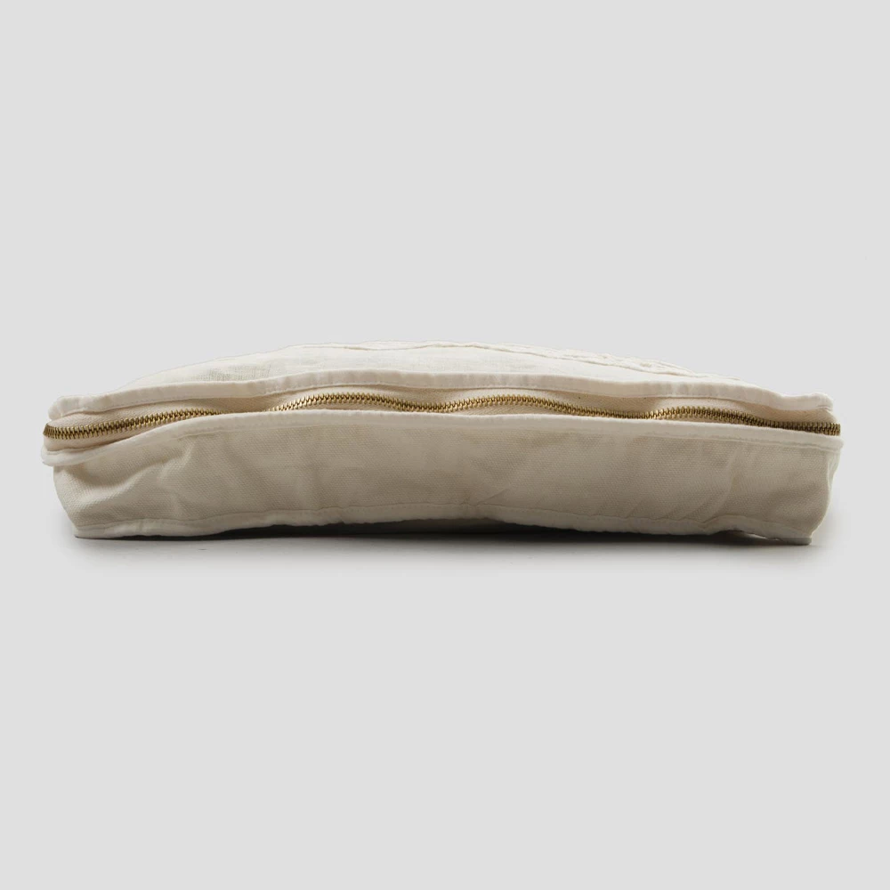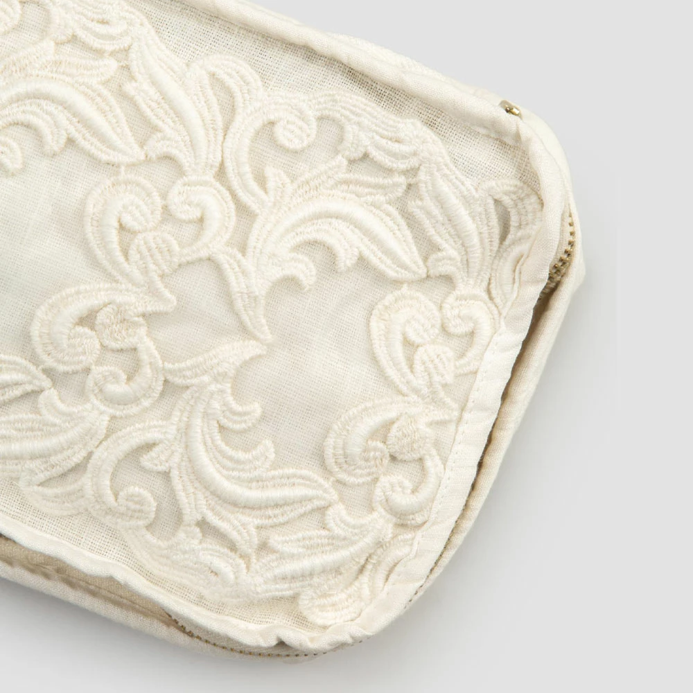 De waarde van traditie voegt zich bij de moderne levensstijl met deze lichtbeige linnen en katoenen rechthoekige middelgrote make- uptas met farnese kant en ritssluiting.