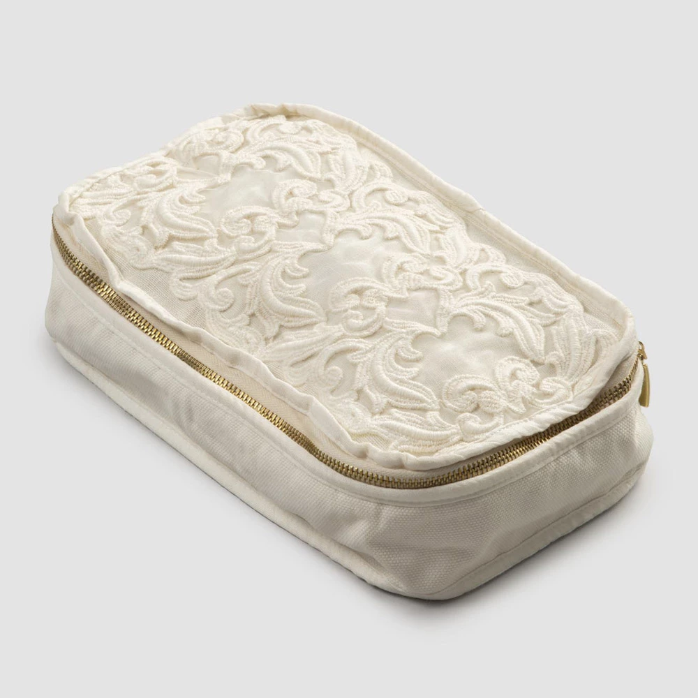 Make-uptasje van linnen en katoen met kant en ritssluiting, luxe made in Italy.