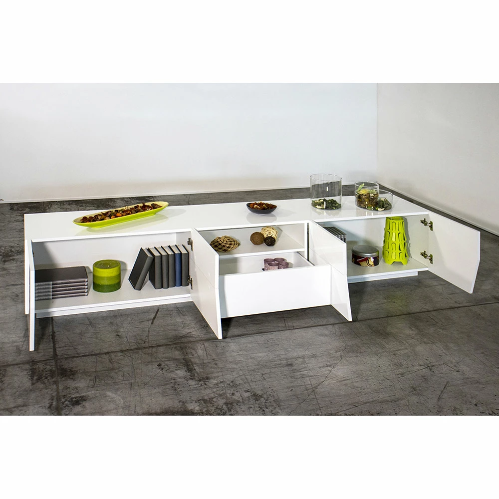 Moderne en elegante tv- kast gemaakt in Italië in melaminehout, ontworpen om de woonkamer op een eigentijdse manier in te richten met een vleugje unieke en verfijnde stijl . De structuur bestaat uit 2 zijcompartimenten met scharnierende opening, een centrale schuiflade en een centraal open compartiment om multimedia-apparaten of elk type object op een ordelijke en georganiseerde manier op te bergen.