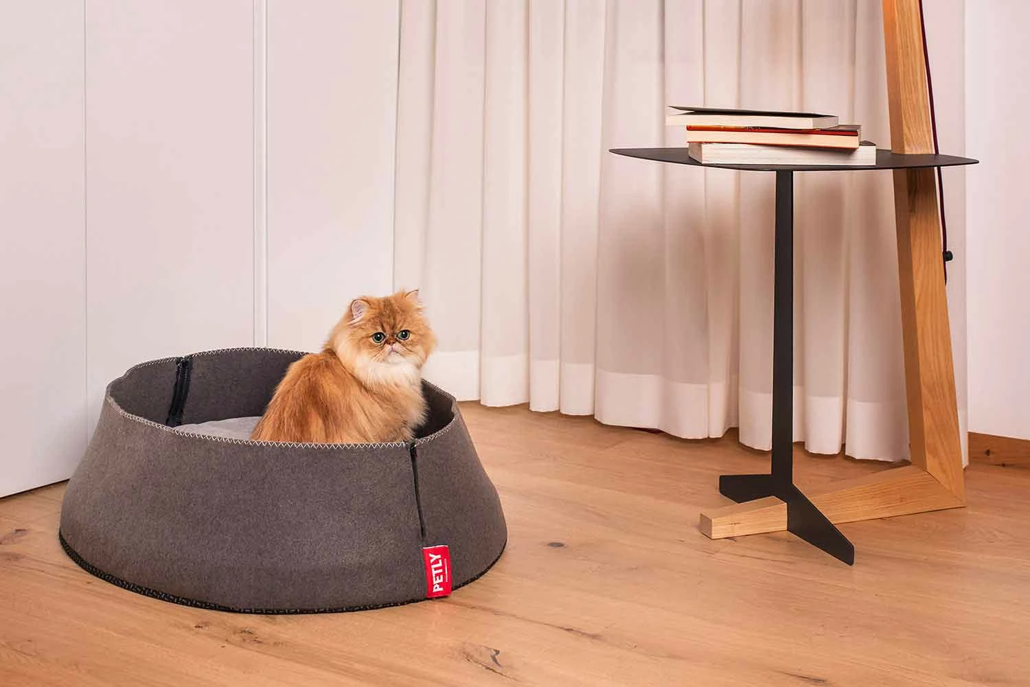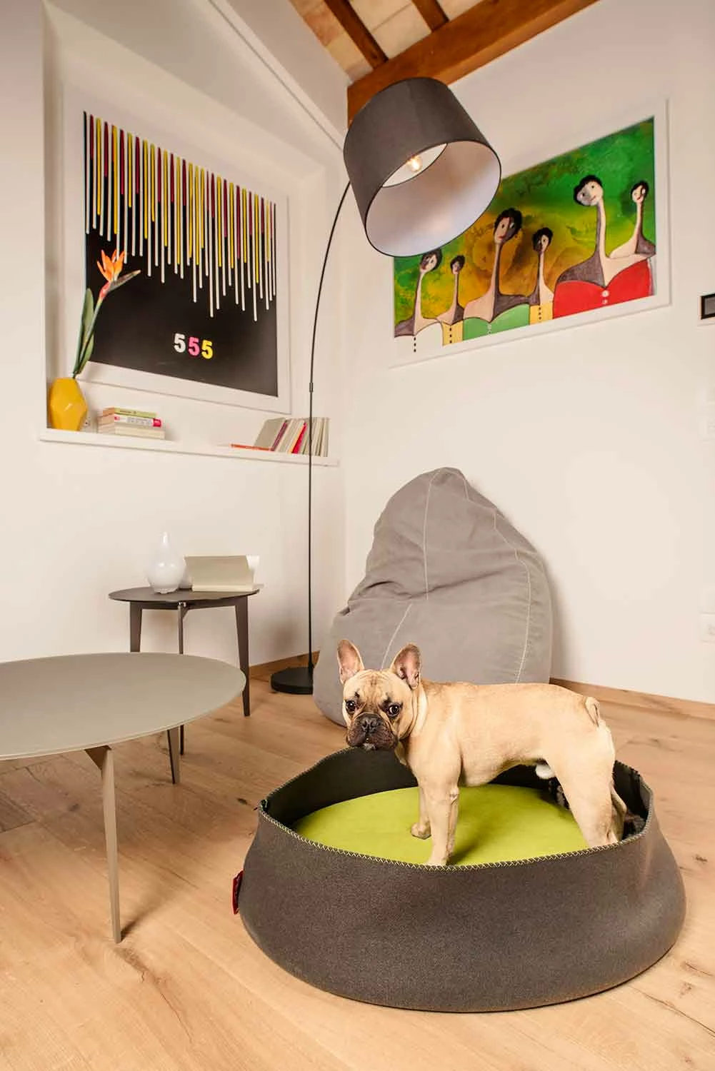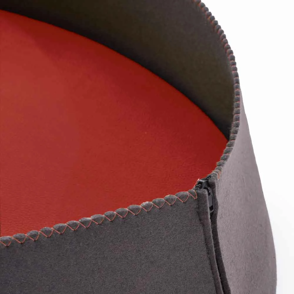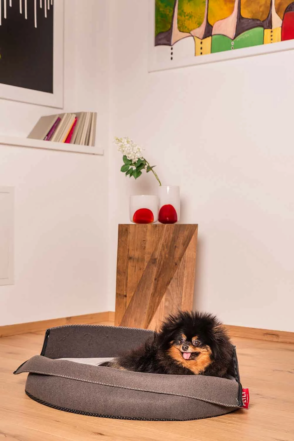 Ovaal hondenhok voor gebruik binnenshuis, in gerecyclede stof en vilt, verwijderbaar en gemaakt in Italië.