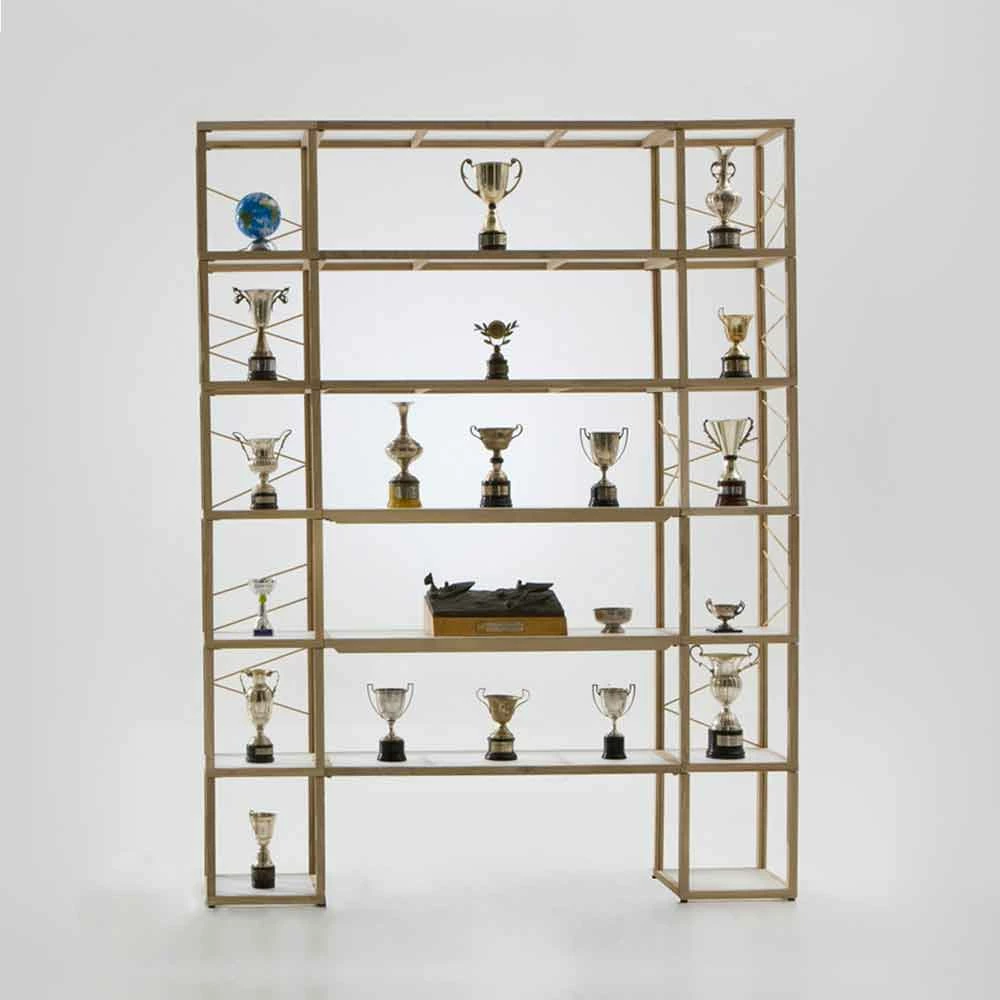 Structuurmaterialen , in massief natuurlijk eiken, bladen zijn in gesatineerd acryl. Op verzoek kunnen de bladen de volgende kleuren hebben: zwart, rood, blauw, gerookt, transparant of gespiegeld. De kant met de deur is transparant. Inbegrepen zijn 4 boekensteunen voor elke module van elke toren.