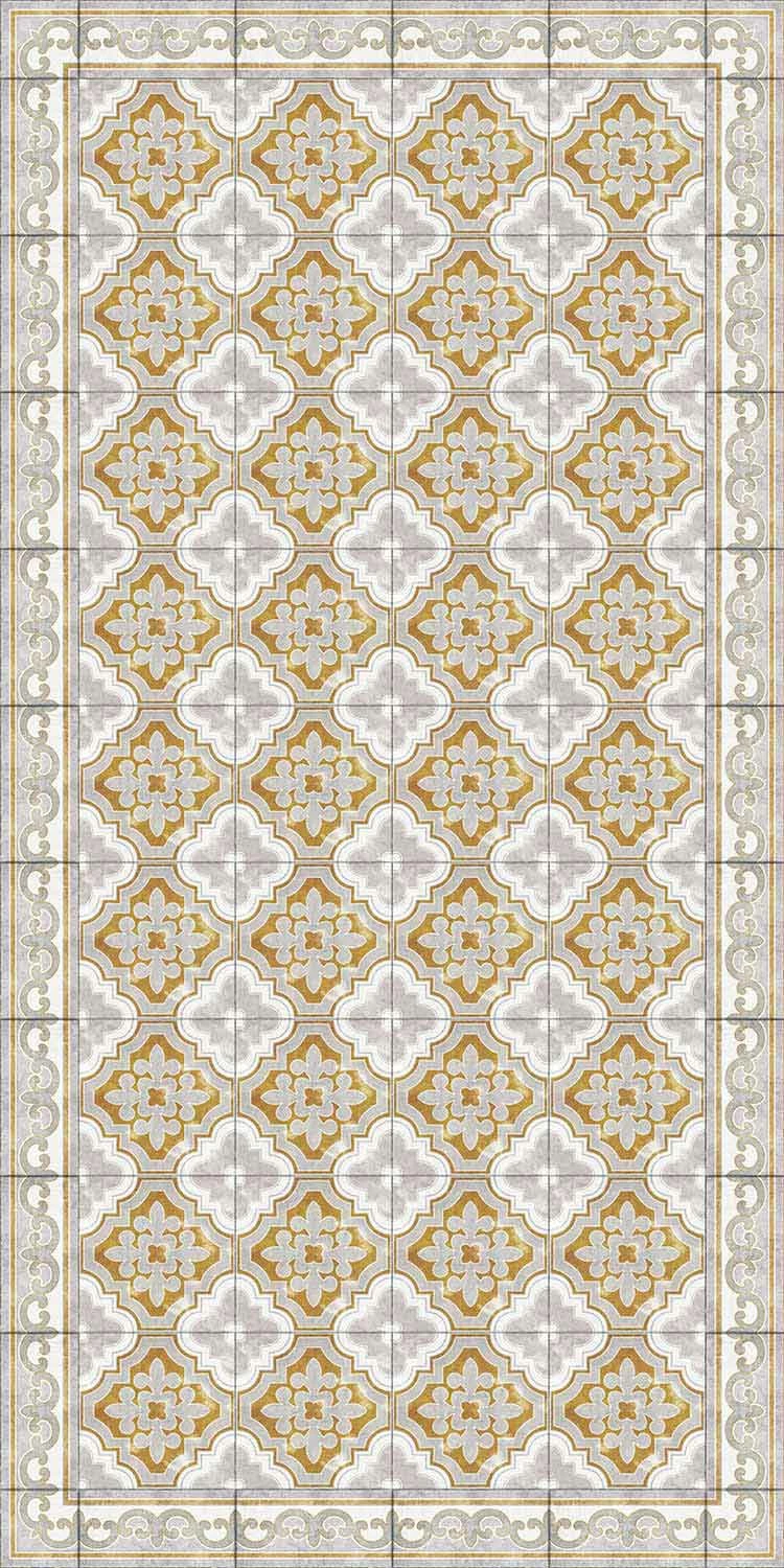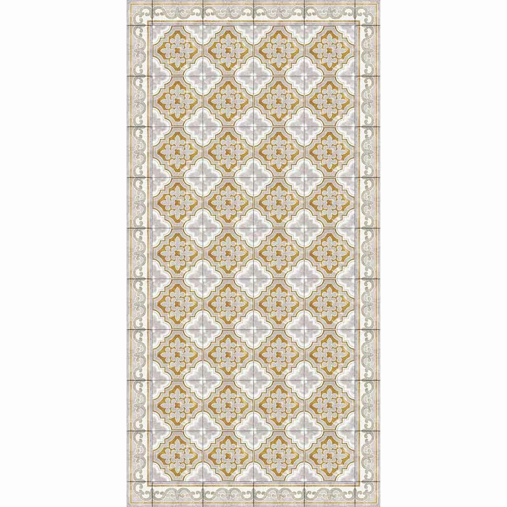 Modern tapijt ideaal om te plaatsen in de woonkamer, woonkamer maar ook in de keuken of eetkamer, gekenmerkt door het bijzondere patroon dat doet denken aan de textuur van majolica tegels. Samengesteld uit een pvc-laag van 2 mm en een polyesterlaag die het product antislip maakt, met daarop een laatste laag met een hoogwaardige print in goudtinten en het waterdichte tapijt.