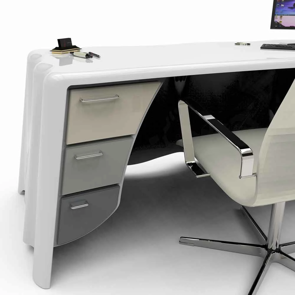 De golvende structuur, nooit lineair, kenmerkt het gevoel van lichtheid en contrasteert met de robuustheid van het materiaal waaruit het is samengesteld: Solid Surface; De drie praktische en ruime lades maken hem ideaal voor het dagelijkse werk. De meerwaarde van dit bureau is, naast het praktische kabelgat, de mogelijkheid tot twee verschillende afwerkingen van het bureau: een wit (RAL9003) en een zwart (RAL9005); in beide gevallen zijn de drie laden één in zuiver wit (RAL9010), één in papyruswit (RAL9018) en tenslotte één in canvasgrijs (RAL7045).