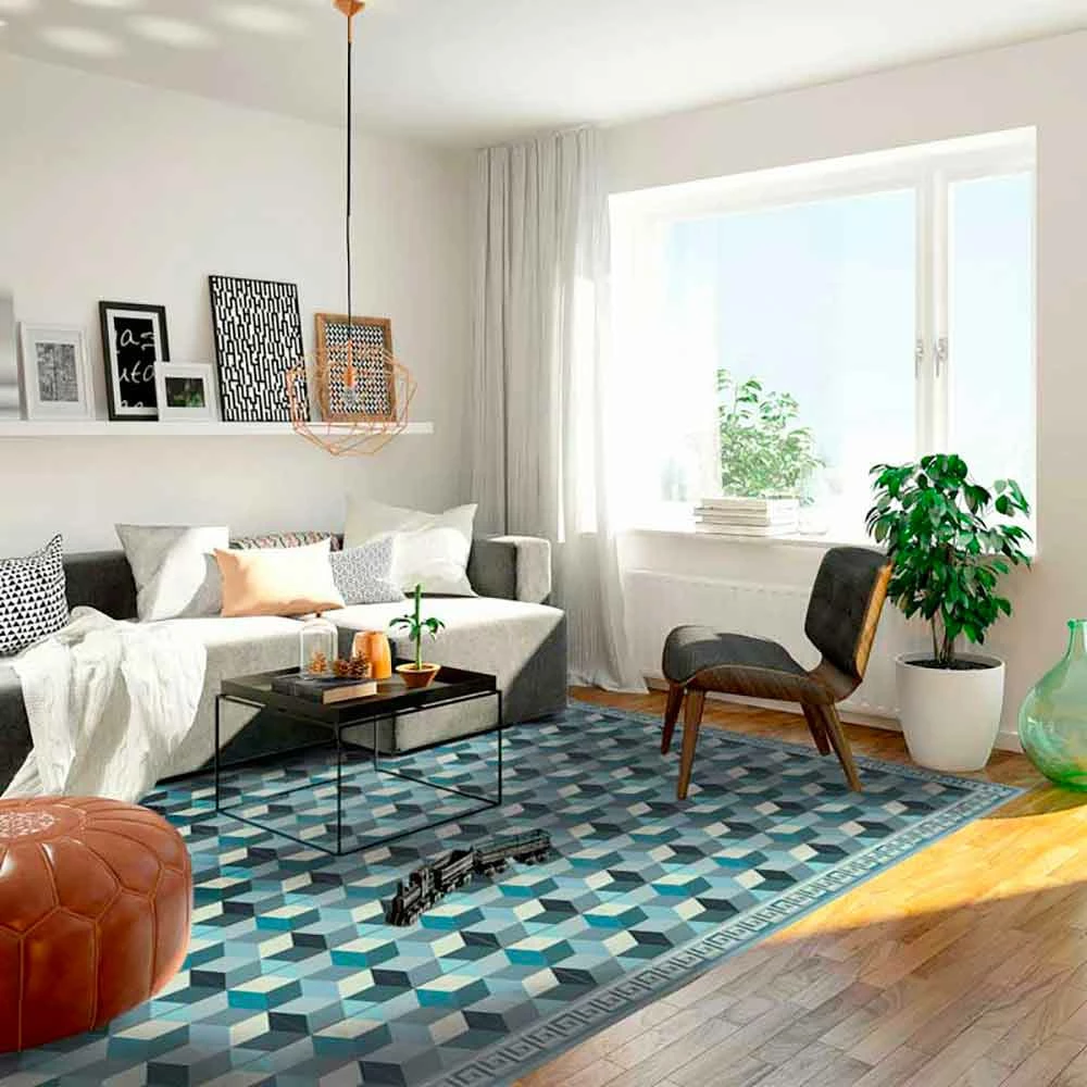 Modern tapijt voor woonkamer gemaakt van pvc en polyester met geometrisch patroon.