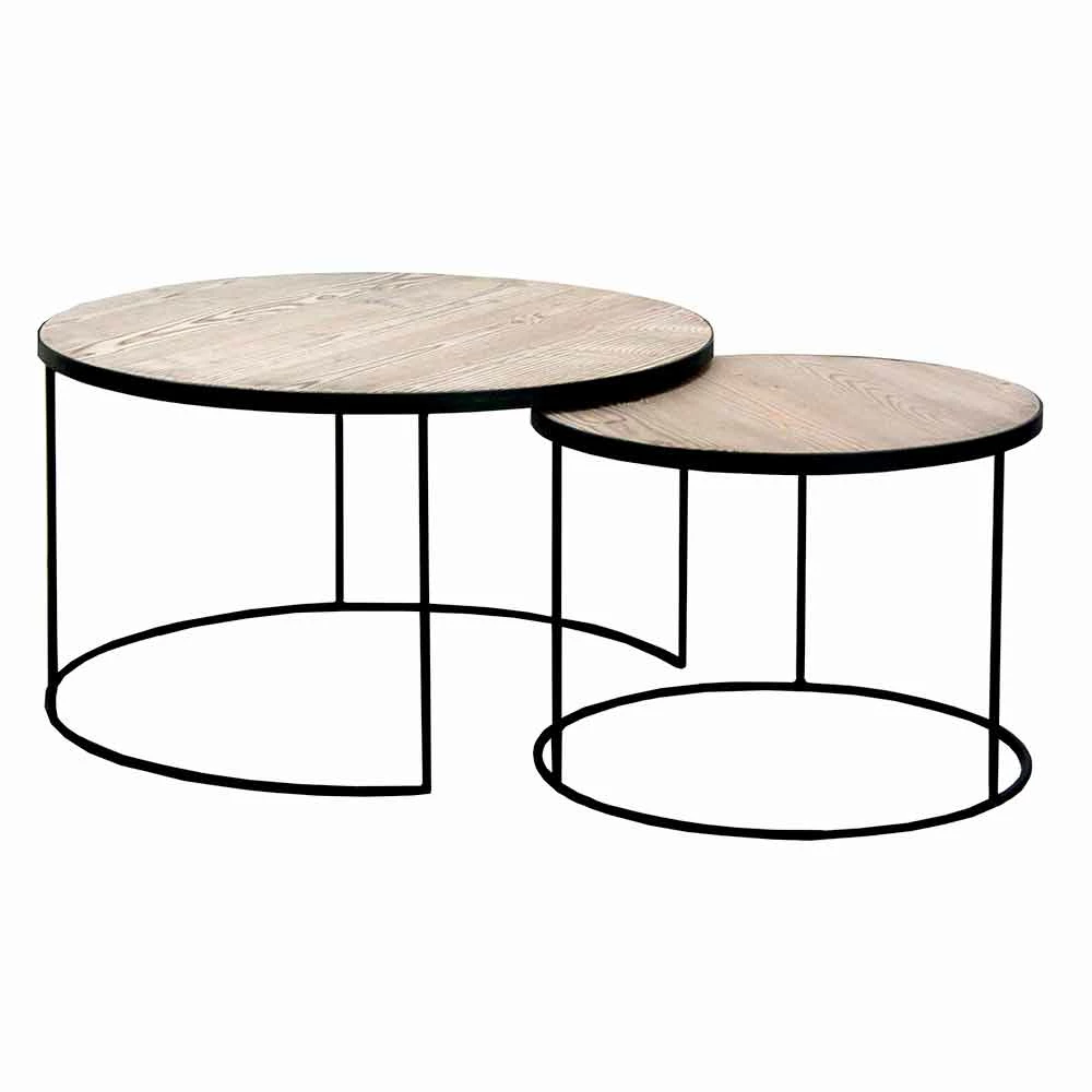 Moderne design ronde salontafels in dennenhout en zwart gelakt metaal.