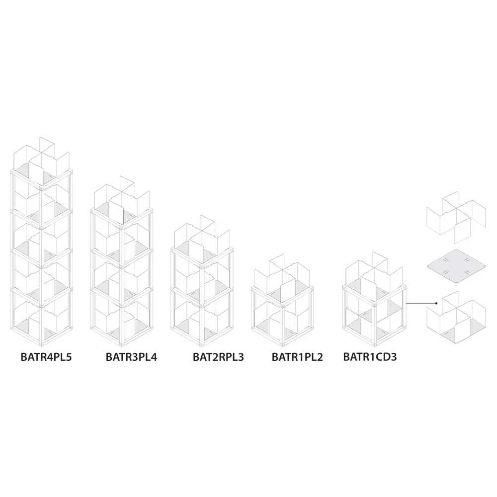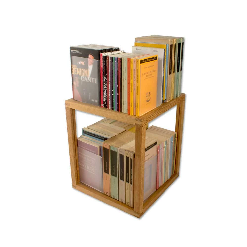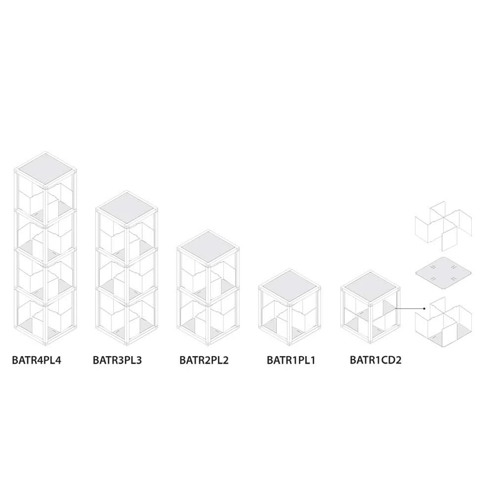 Het in elkaar zetten van Tante Babel is heel eenvoudig in elkaar te zetten, de modules overlappen elkaar zonder dat er gereedschap nodig is. Zelfs de boekensteunen bestaan uit twee in elkaar grijpende elementen op een speciaal oppervlak met inkepingen. Met een tussenvloer kunt u de capaciteit verdubbelen voor cd’s of boeken en kleine voorwerpen.