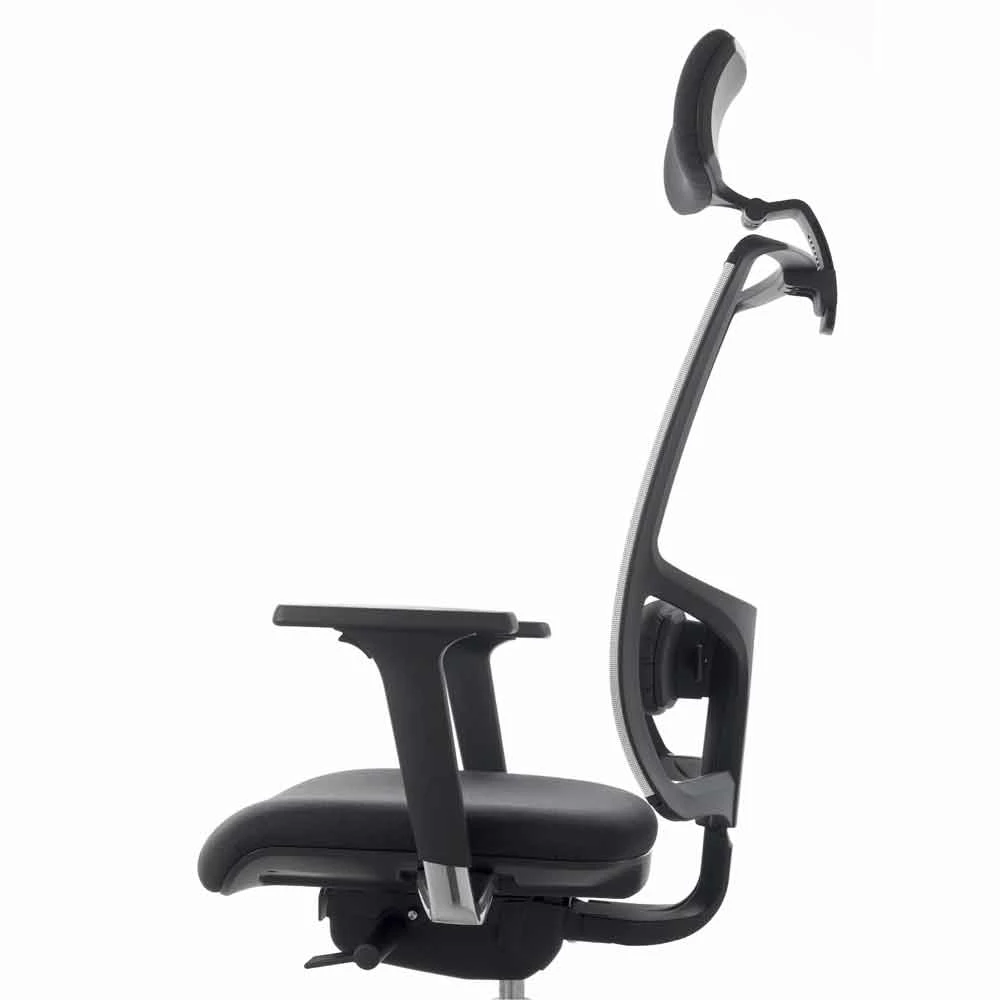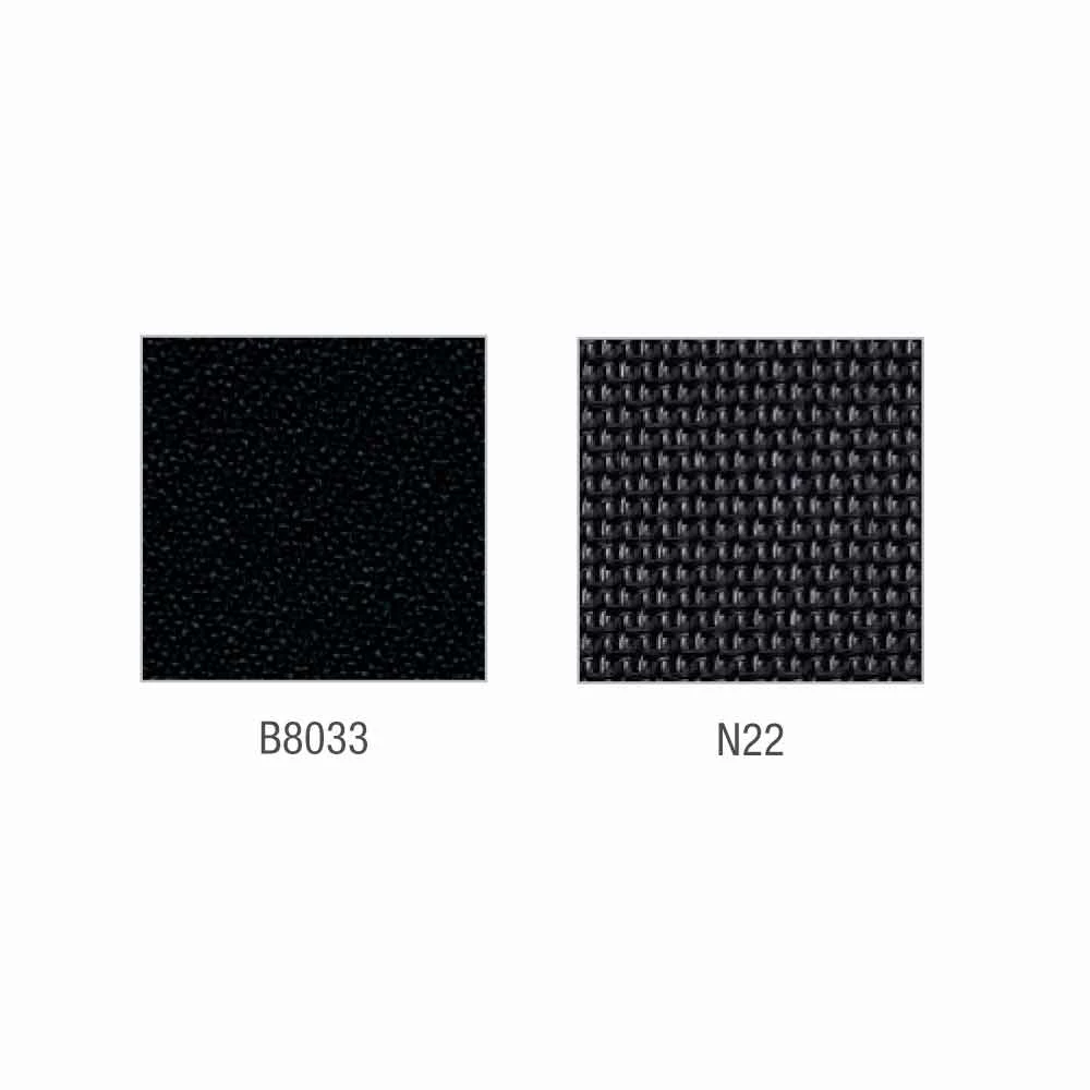Het unieke van de Mina-stoel zijn de in hoogte verstelbare armleuningen met drukknopbediening, met een slag van 70 mm, een translatie naar voren / naar achteren en een breedte (3D), gemaakt van gepolijst gegoten aluminium, compleet met tops en plastic onderdelen in 15% PA6 nylon met glasvezel in zwarte afwerking, compleet met zwarte zachte PU-top.