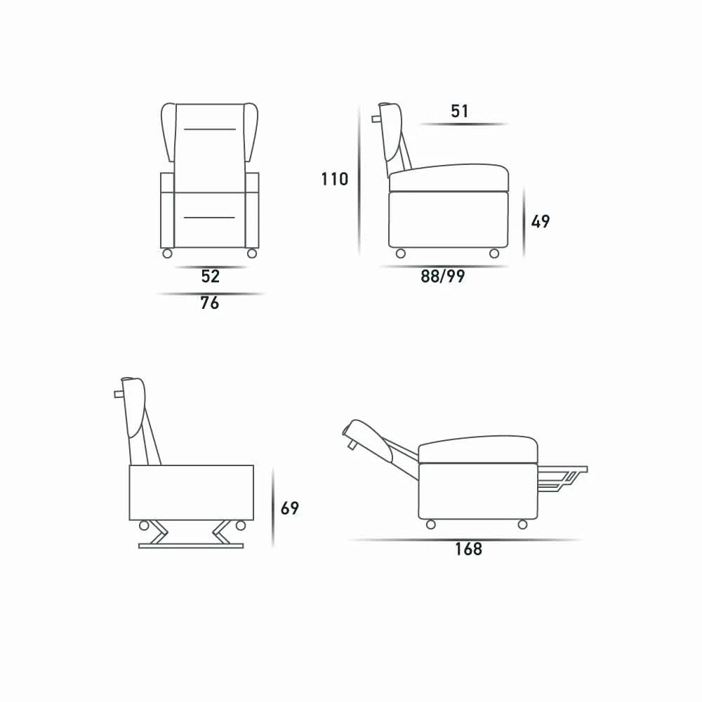 Uitgerust met een 4-motorig systeem dat onafhankelijke bewegingen van de rugleuning en het voeteneinde garandeert. Naast de klassieke relax- en lifthoudingen kan Giglio ook zeer functionele houdingen innemen voor orthopedisch-sanitaire doeleinden, vooral handig in gevallen waar er fysieke behoeften zijn die je dwingen om in een fauteuil te blijven zitten. In feite maakt het systeem het mogelijk om de stoel omhoog te kantelen in een positie zonder zwaartekracht, of om de stoel ongeveer 20 cm omhoog te brengen, waarbij de zitting parallel aan de vloer blijft. Deze parallelle beweging maakt het mogelijk om naar een tafel te gaan, voor de lunch of voor elke andere behoefte, terwijl u comfortabel blijft zitten. Elke stress en ongemak van positieverandering wordt vergemakkelijkt.