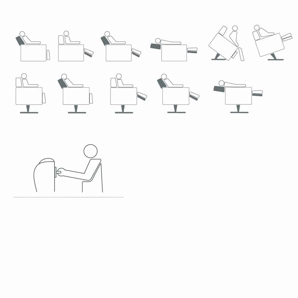 Mechanismen voor een of twee motoren, de beweging van treeplank en rugleuning afwisselend autonoom of onafhankelijk, heffunctie, alzapersona- apparaat dat het mogelijk maakt om gemakkelijk de rechtopstaande positie in te nemen, vibromassage voor een aangenaam verdeeld effect op de rug, zitting en treeplank, automatische of gemotoriseerde beweging , zijn dit de mogelijkheden en de ontwikkelde combinaties: een harmonieus geheel van oplossingen om aan elke behoefte te voldoen.