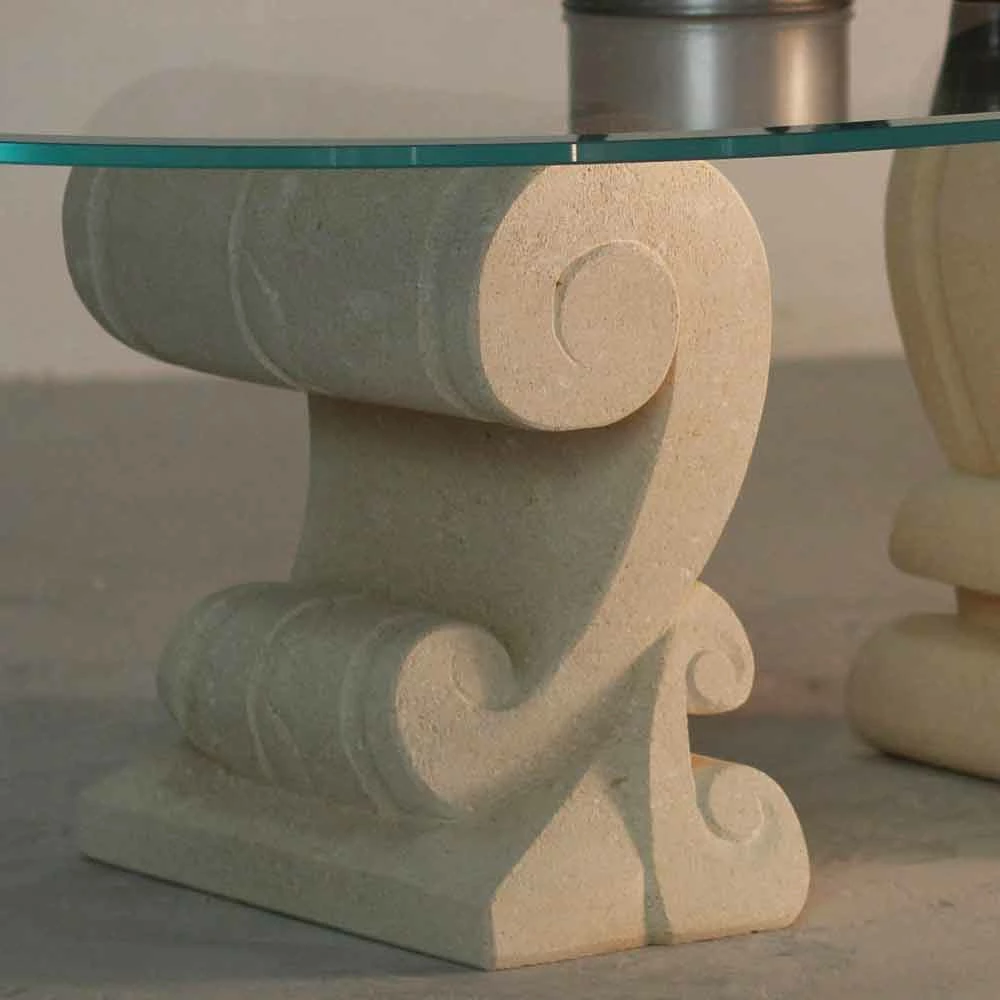 Klassieke ovale salontafel Gemaakt in Italië met dubbele voet in natuurlijke Vicenza steen, met de hand gesneden uit het blok en met een floatglas top van 12 mm dik, rustend op de basissen.