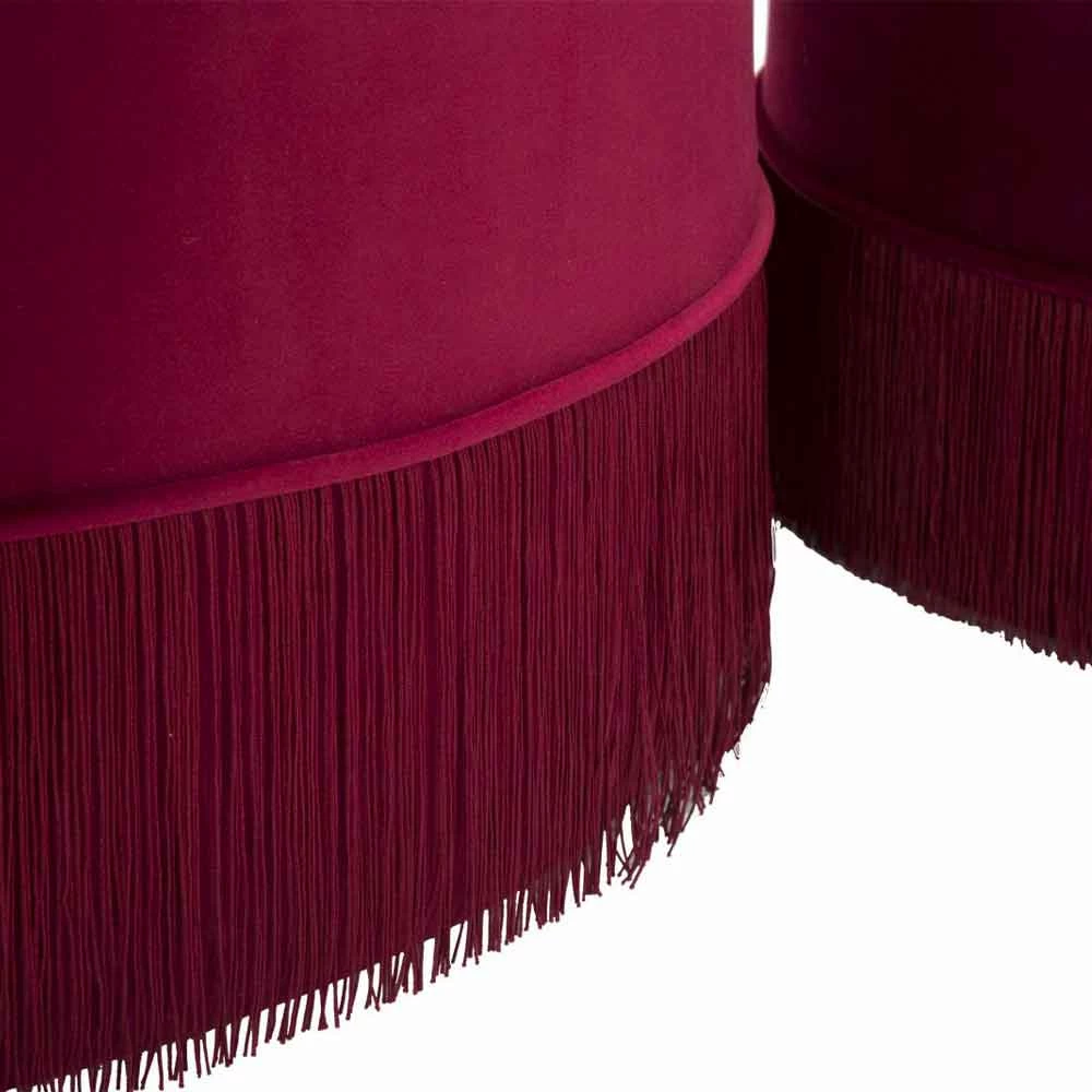 Paar poefs met bordeaux kleurige houder in hout met design fluwelen zitting.