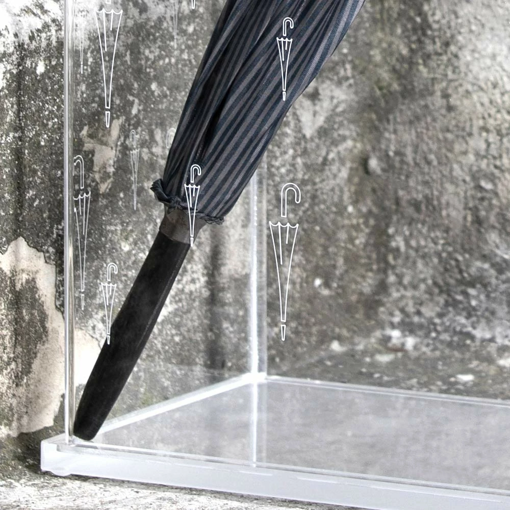 Deze rechthoekige paraplubak heeft een structuur die volledig is gemaakt van transparant acrylkristalgeslepen en lasergegraveerd met versieringen van gestileerde paraplu’s, voor een dikte van 3 mm.