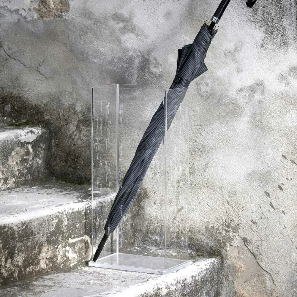 Paraplubak van transparant acrylkristal met decoratieve paraplu’s gemaakt in Italië.