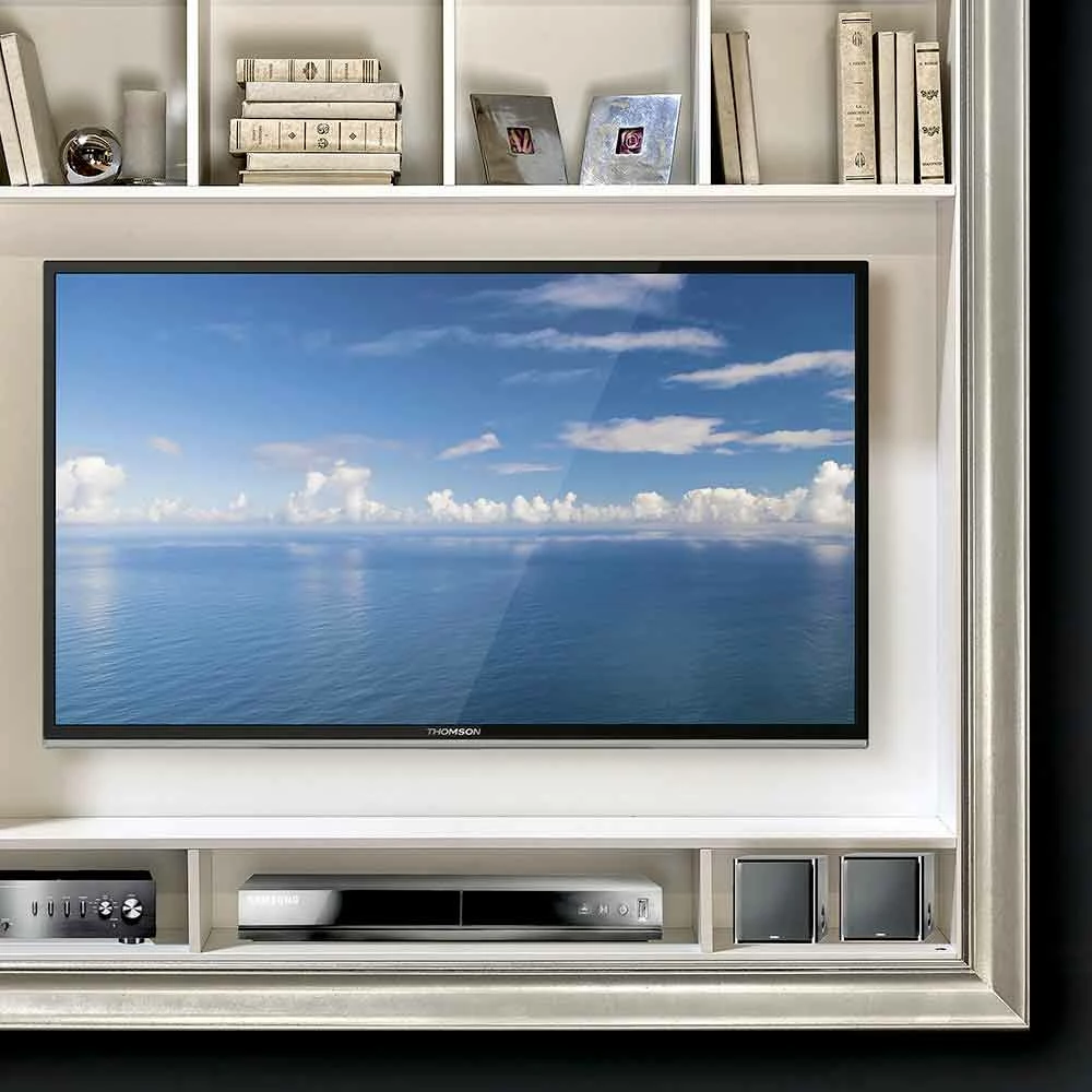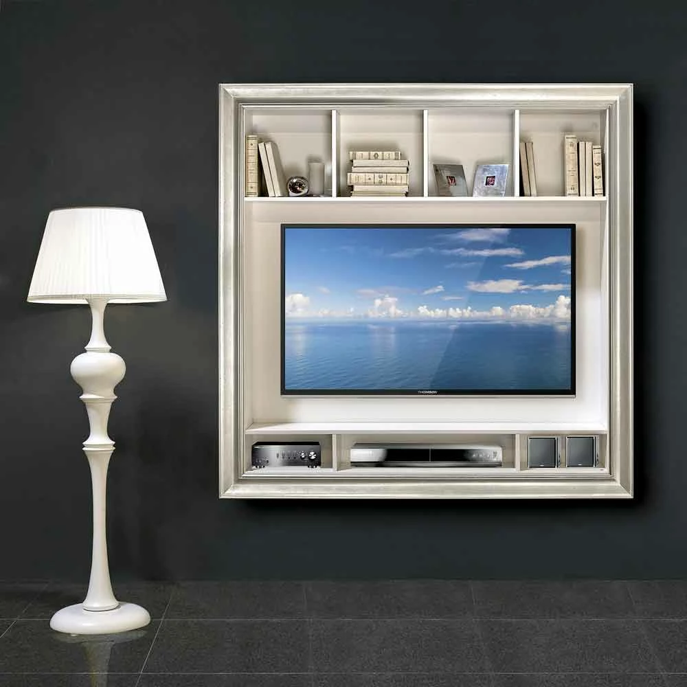 Fotolijst met aan de wand gemonteerde plasmahouder van ayos hout en houtpulp, met de hand gedecoreerd, perfect voor uw woonkamer.