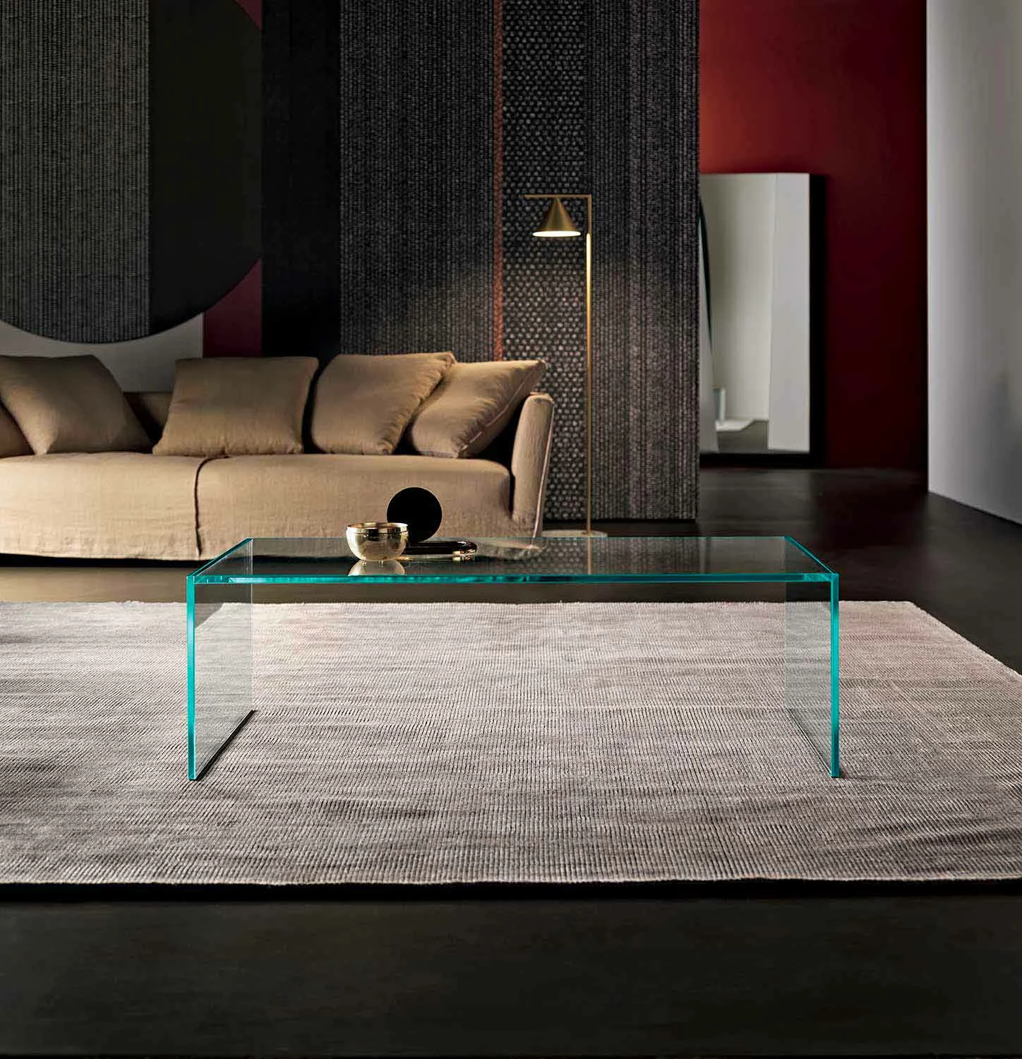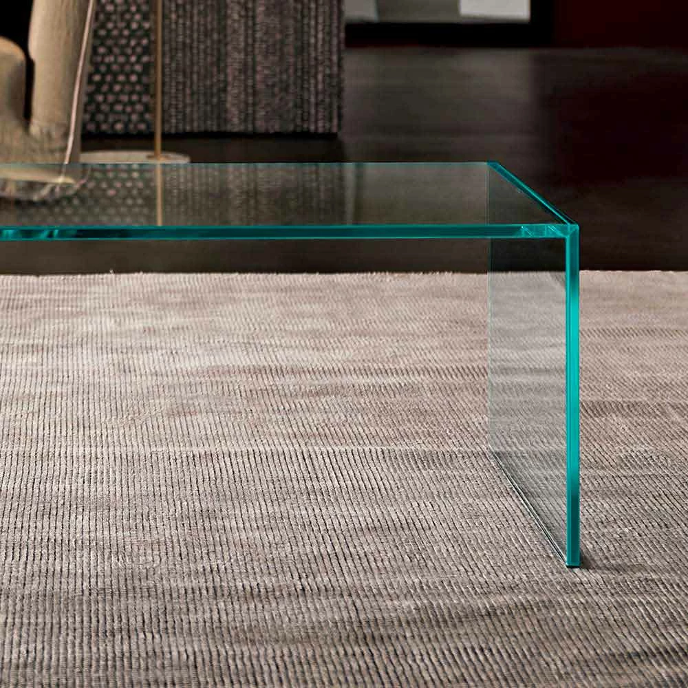 Modern vormgegeven rechthoekige salontafel in extra helder glas, handgemaakt in Italië.