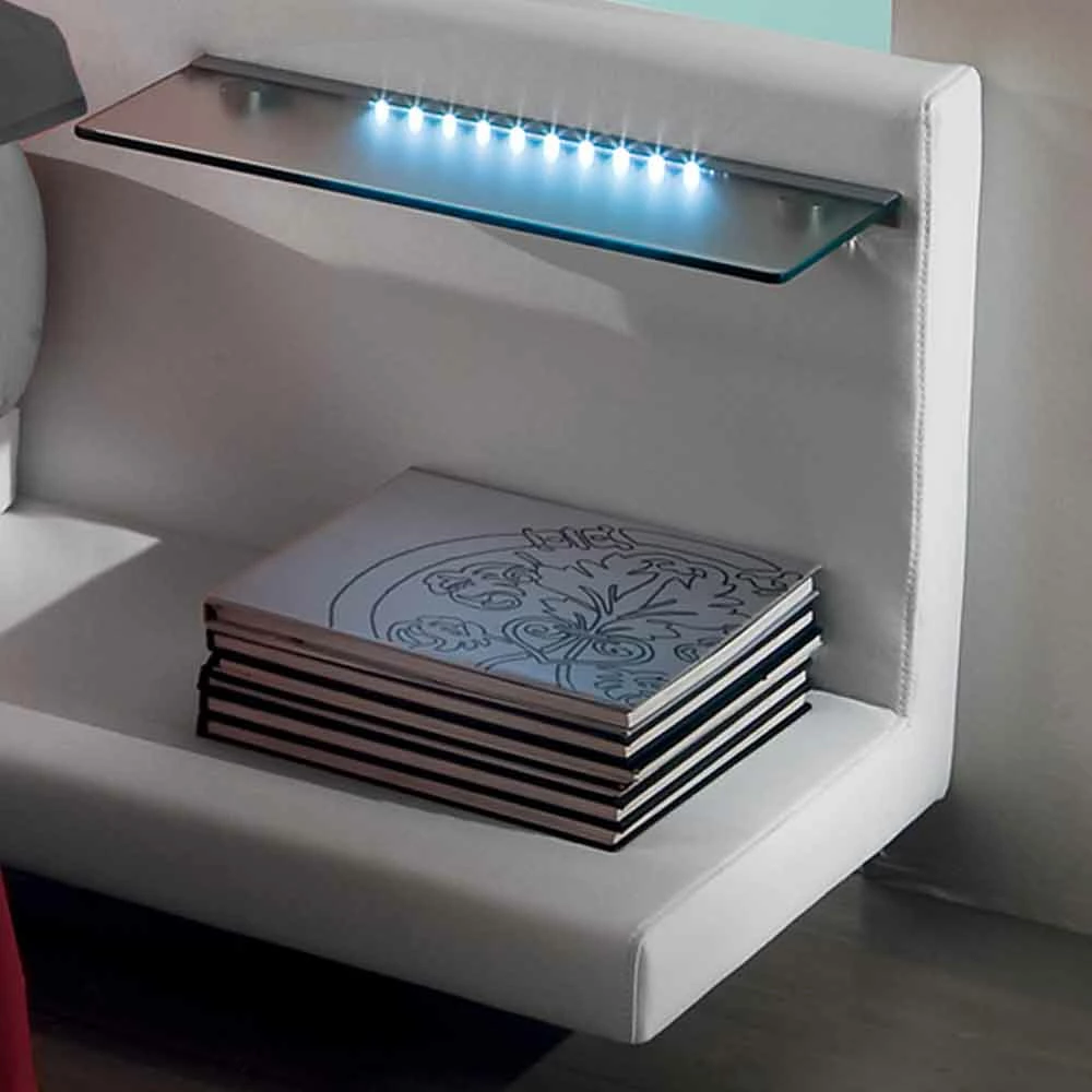 Rond tweepersoonsbed met een uniek en verfijnd ontwerp dat wordt gekenmerkt door het uitgeruste hoofdeinde dat het bed nog praktischer en functioneler maakt, inclusief een bank in massief hout en multiplex opgevuld met polyurethaanschuim bedekt met polyesterwatten en / of gekoppeld fluweel. Ook op het hoofdeinde bevinden zich twee glazen planken met LED-licht die fungeren als praktische nachtkastjes en een schuimrubberen kussen in het bovenste gedeelte en bedekt met stof in dezelfde kleur als het eco-leer dat het bed bedekt.