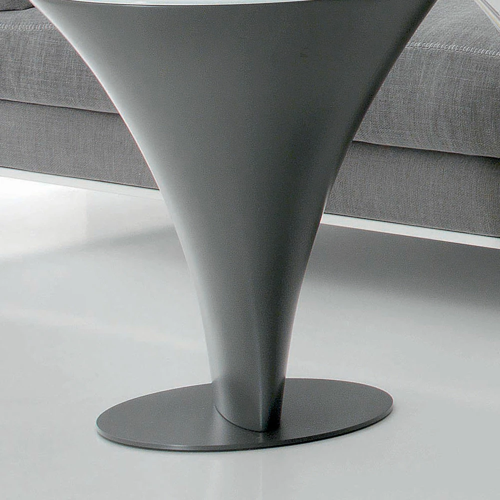 Deze ronde salontafel heeft een structuur in polyurethaan en een gelakt metalen onderstel met mat glas.