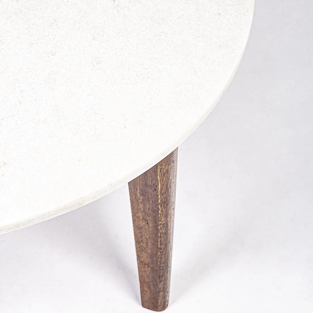Lage ronde salontafel in mangohout en marmeren blad, 2 maten.
