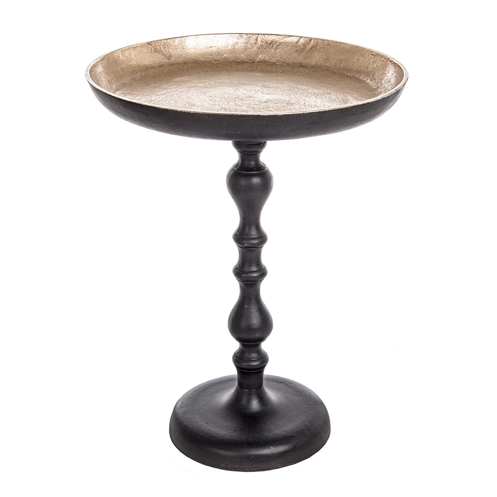 Ronde salontafel in verzilverd en verouderd aluminium met een klassiek design.