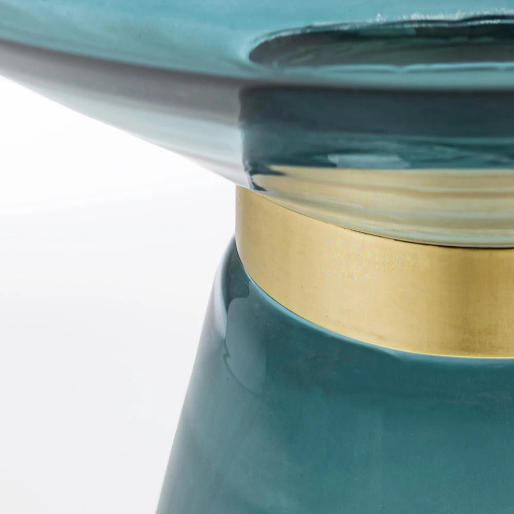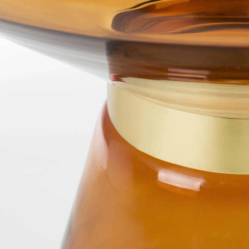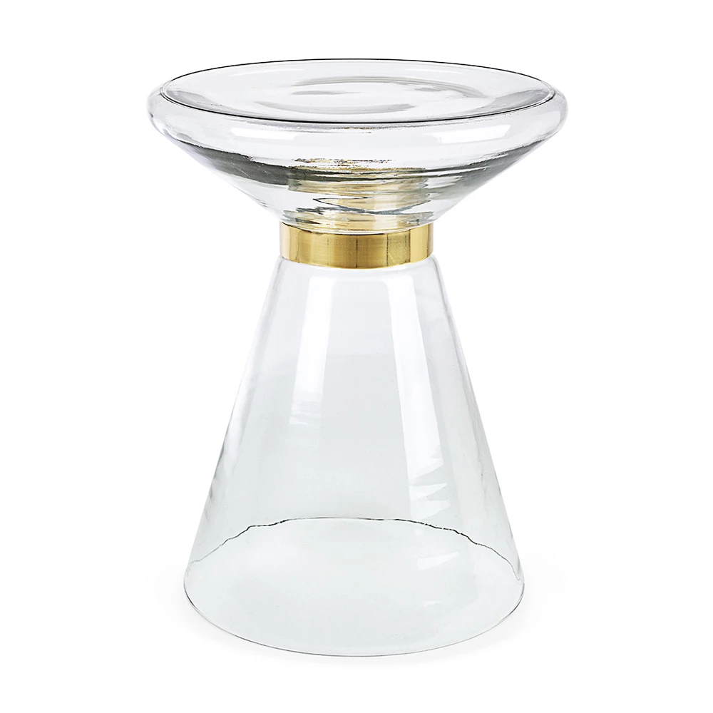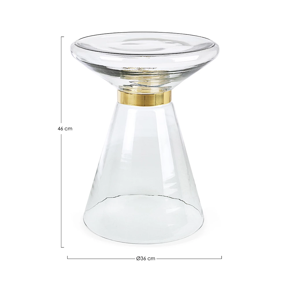 Salontafel in glas 3 afwerkingen en decoratie in vermessingd staal.