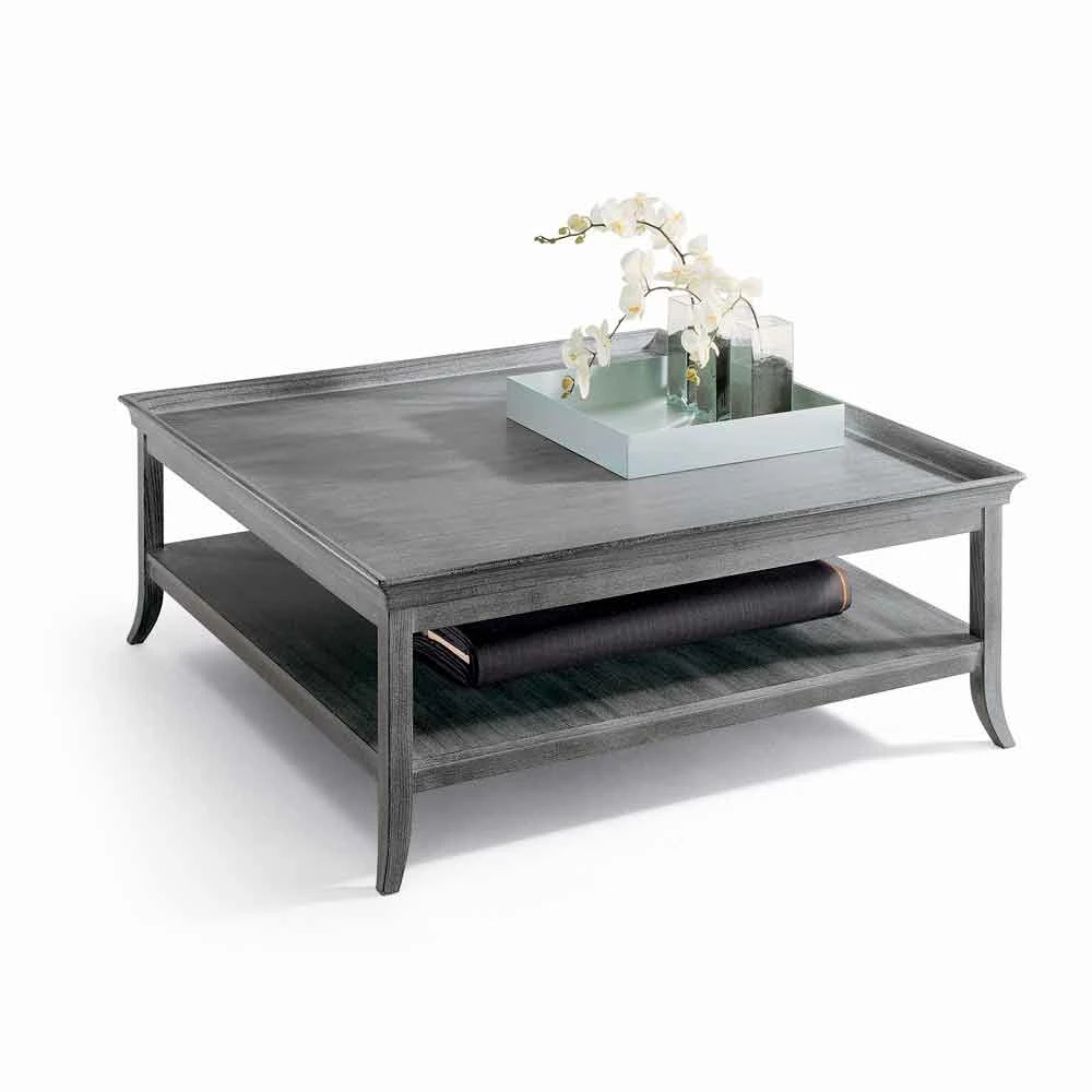 Salontafel met tussenschot, in beukenhout. Afwerking: gelakt grijs / zilver.