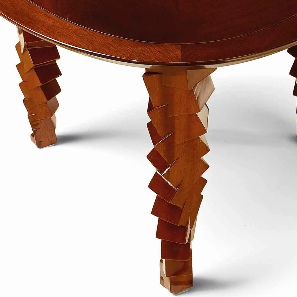 Tafel in hout met gesneden benen. Verkrijgbaar in natuurlijke gepolijste mahonie finish.