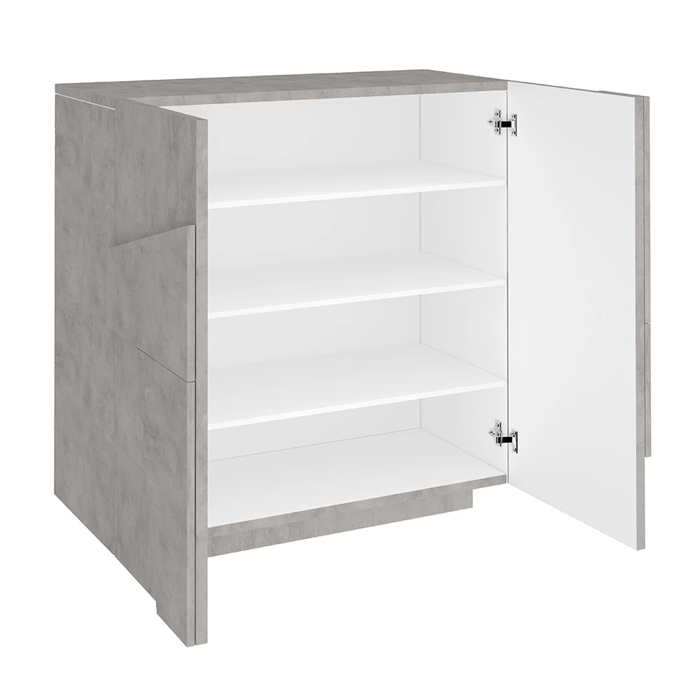 Het schoenenrek bestaat uit 2 scharnierende deuren die speciaal zijn gemaakt door het geometrische snijwerk in reliëf op het oppervlak, waardoor 4 containercompartimenten worden afgesloten, die een grote opslagruimte garanderen. Het is gemaakt van melamine en 100% Made in Italy . Dit product leent zich voor het voltooien van de inrichting van elke woonruimte dankzij de eenvoudige en elegante afwerkingen die de omgeving een uniek en onvergetelijk tintje geven. Het gebruikte materiaal garandeert kwaliteit en duurzaamheid, zelfs in de loop van de tijd.