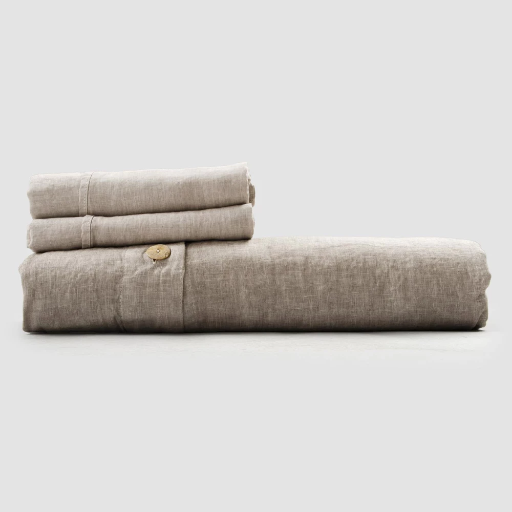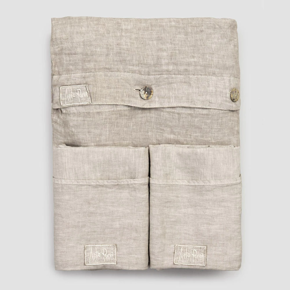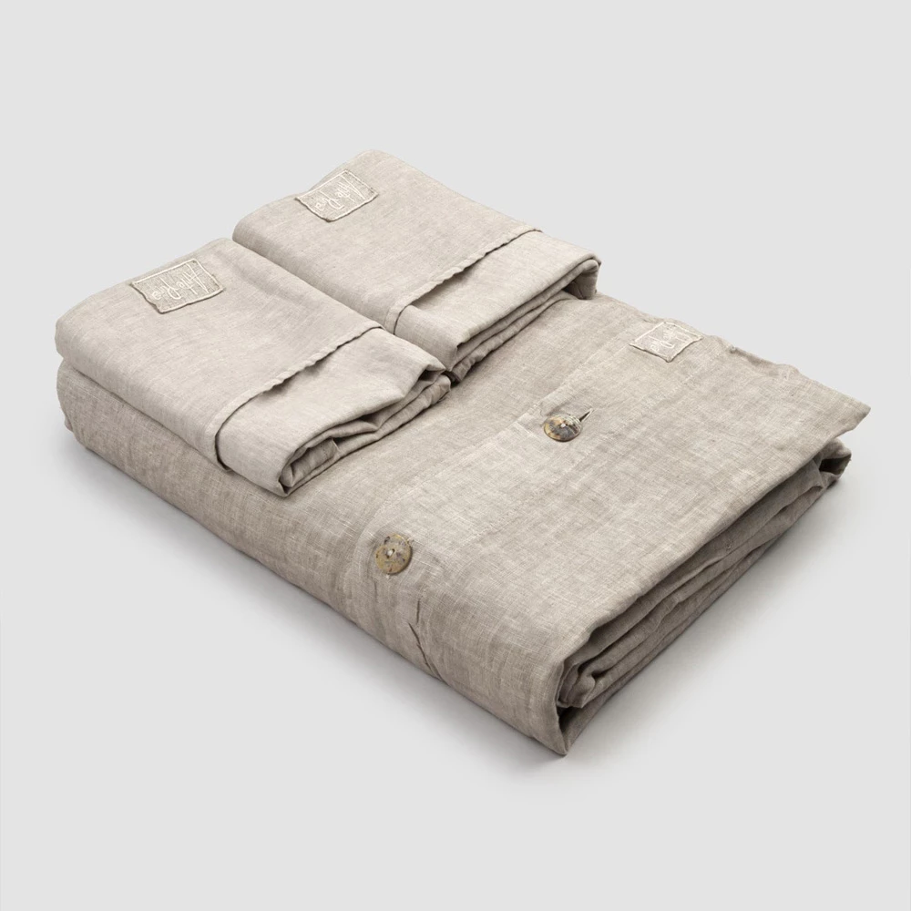 De waarde van traditie voegt zich bij de moderne levensstijl met deze lichtbeige linnen set met Agoya-knopen in parelmoer en klep voor het tweepersoonsbed, inclusief: