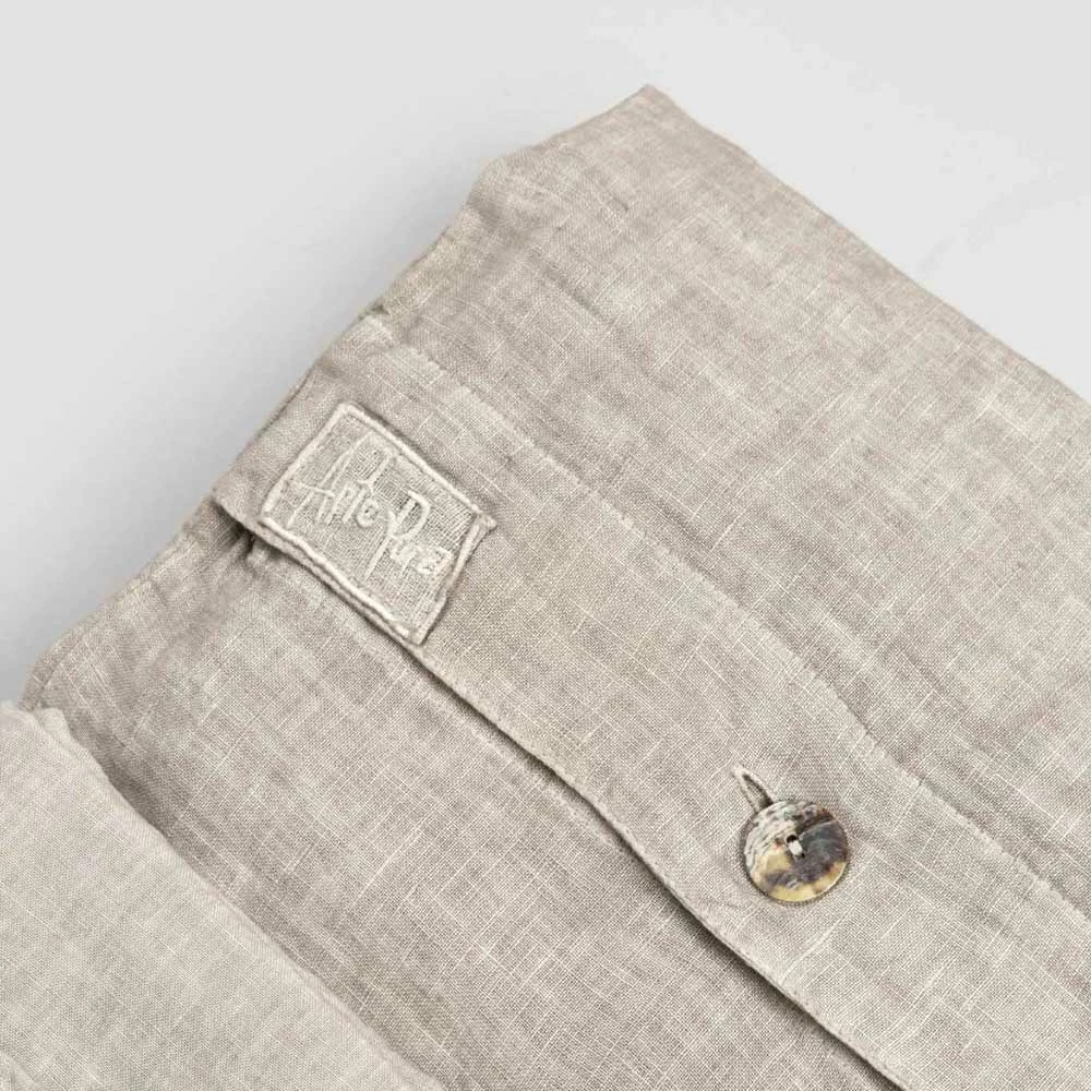 Licht linnen pak voor 2 personen met parelmoeren knopen en flap, luxe made in Italy.