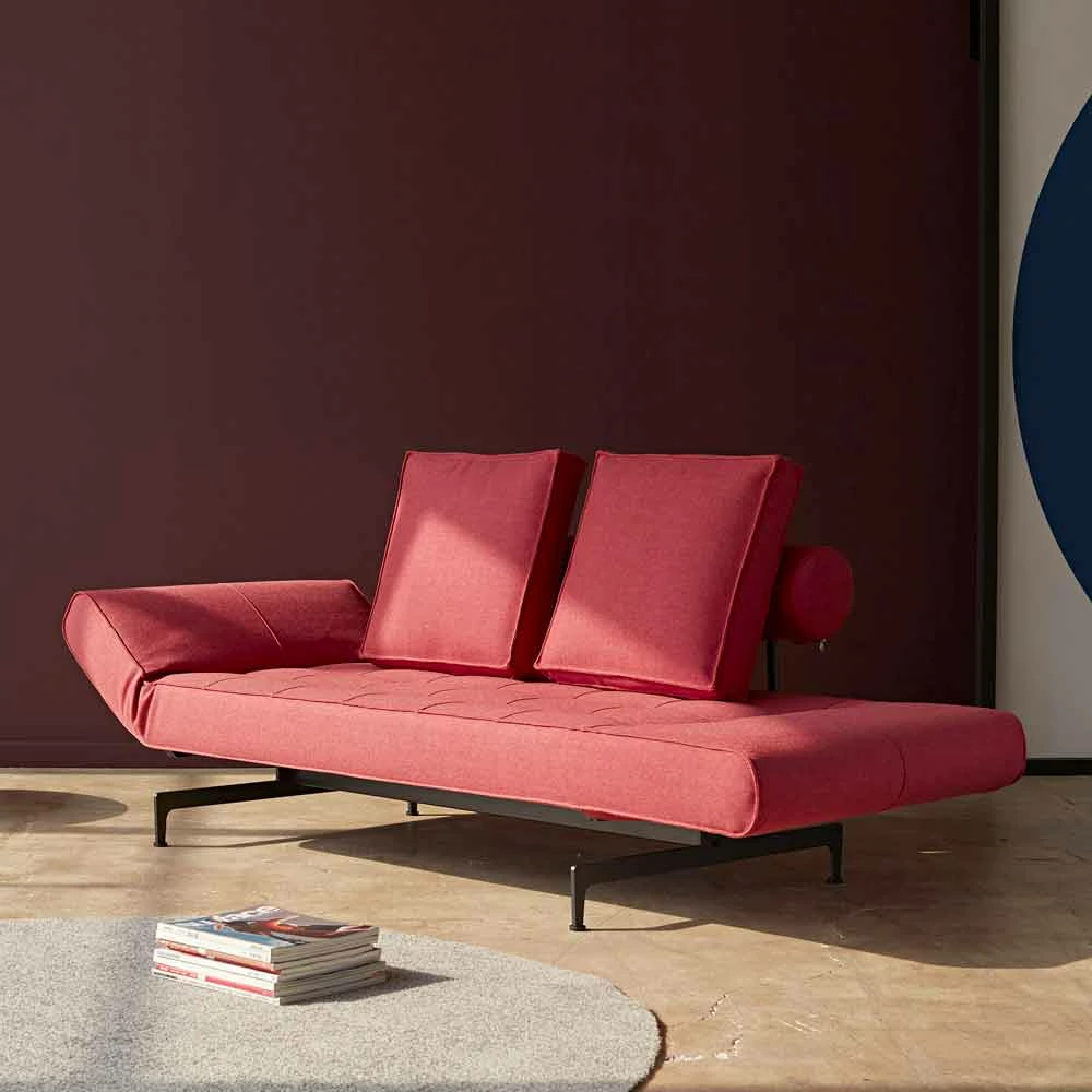 Ghia is de tweezitsbank maar ook een chaise longue of een eenpersoonsbed dankzij de individueel verstelbare zijkanten in drie standen, bank, relax en bed.
