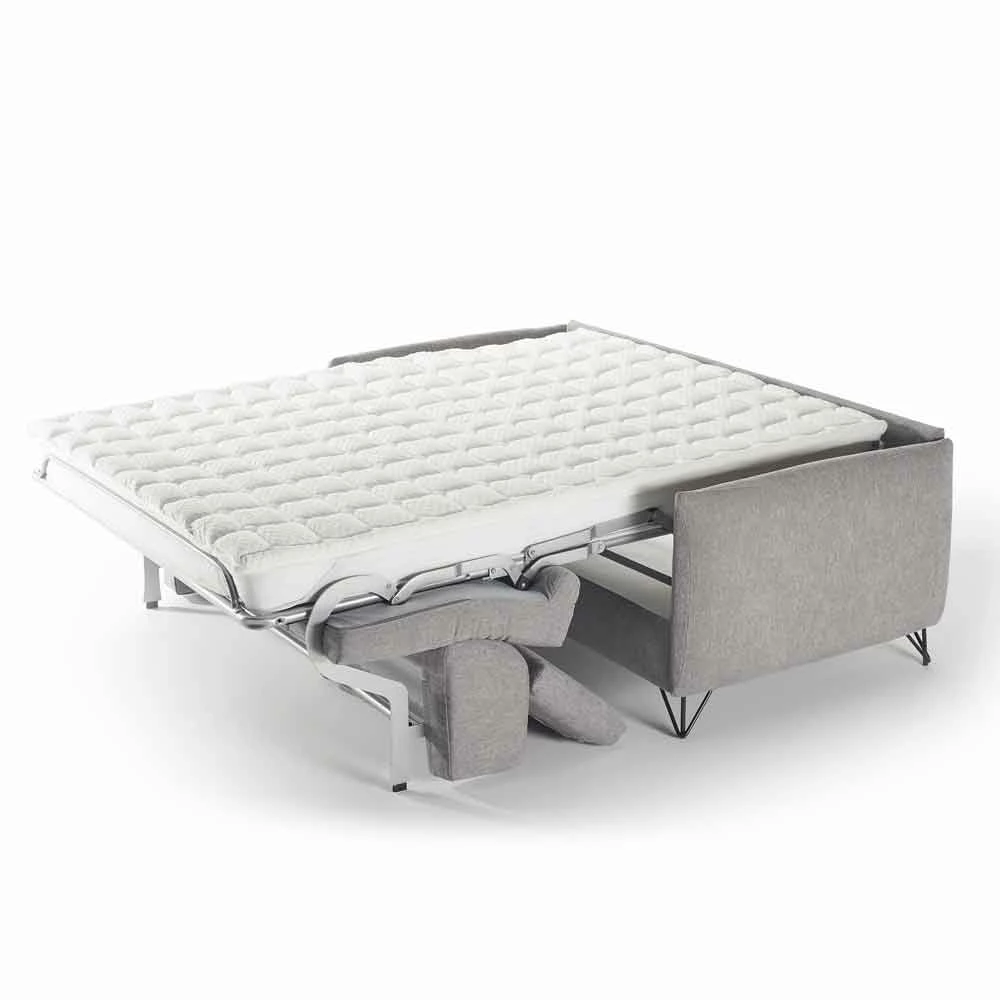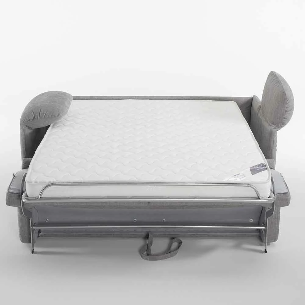 Vittorio is uitgerust met een openingsmechanisme voor de bank in een enkele rotatie, Otello H12 genaamd, waarmee u de rug- en zitkussens aan het netwerk kunt haken; de bedbodem is standaard en is elektrisch gelast met elastische banden in het zitgedeelte en de versie met latten is ook beschikbaar op aanvraag, lees hoe u deze kunt krijgen door te schrijven naar [email protected].