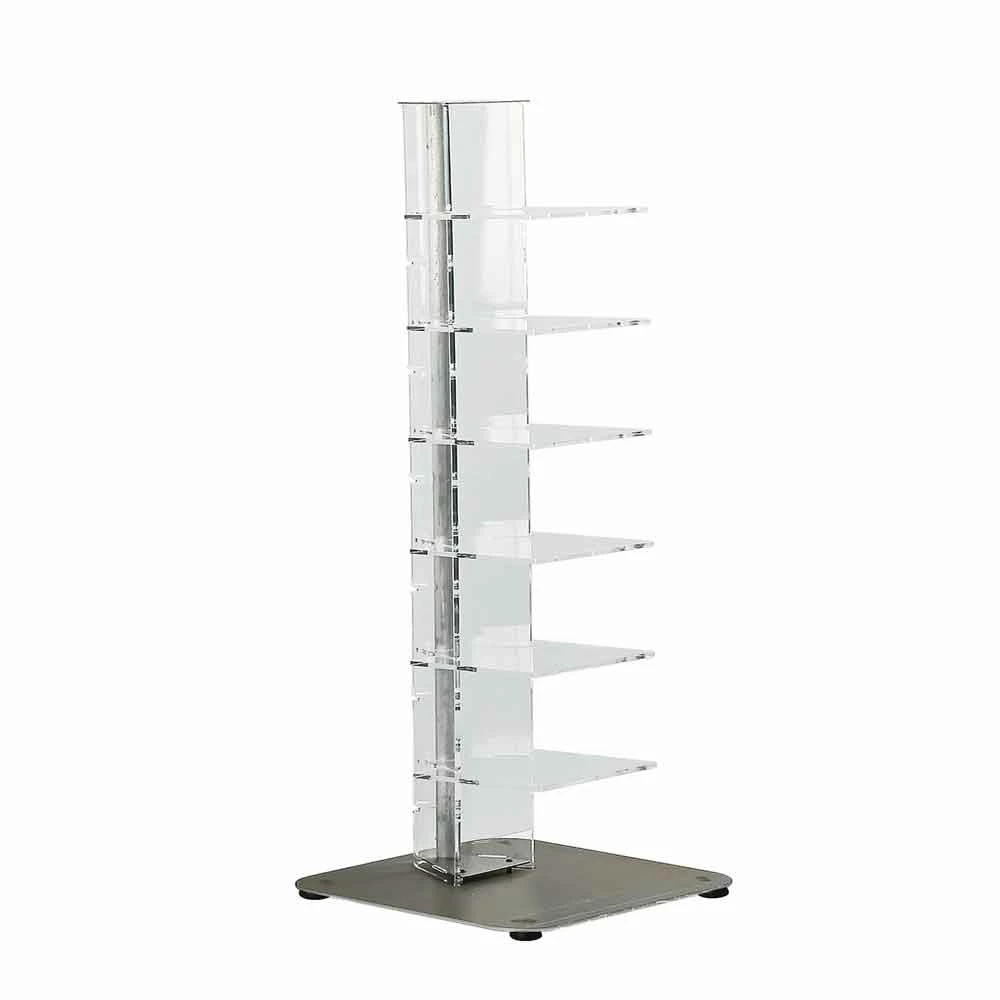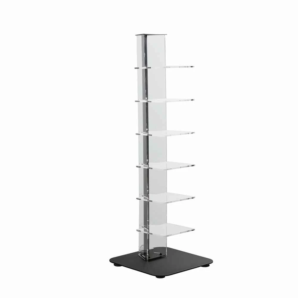 Bibliotheek: lichaam en planken in transparante 6 mm dik methacrylaat. Base en pole verkrijgbaar in de volgende uitvoeringen: natuurlijke metaal, geschilderd zwart en wit. Voeten in zwart kunststof. Op verzoek lichaam en planken in satijn methacrylaat.