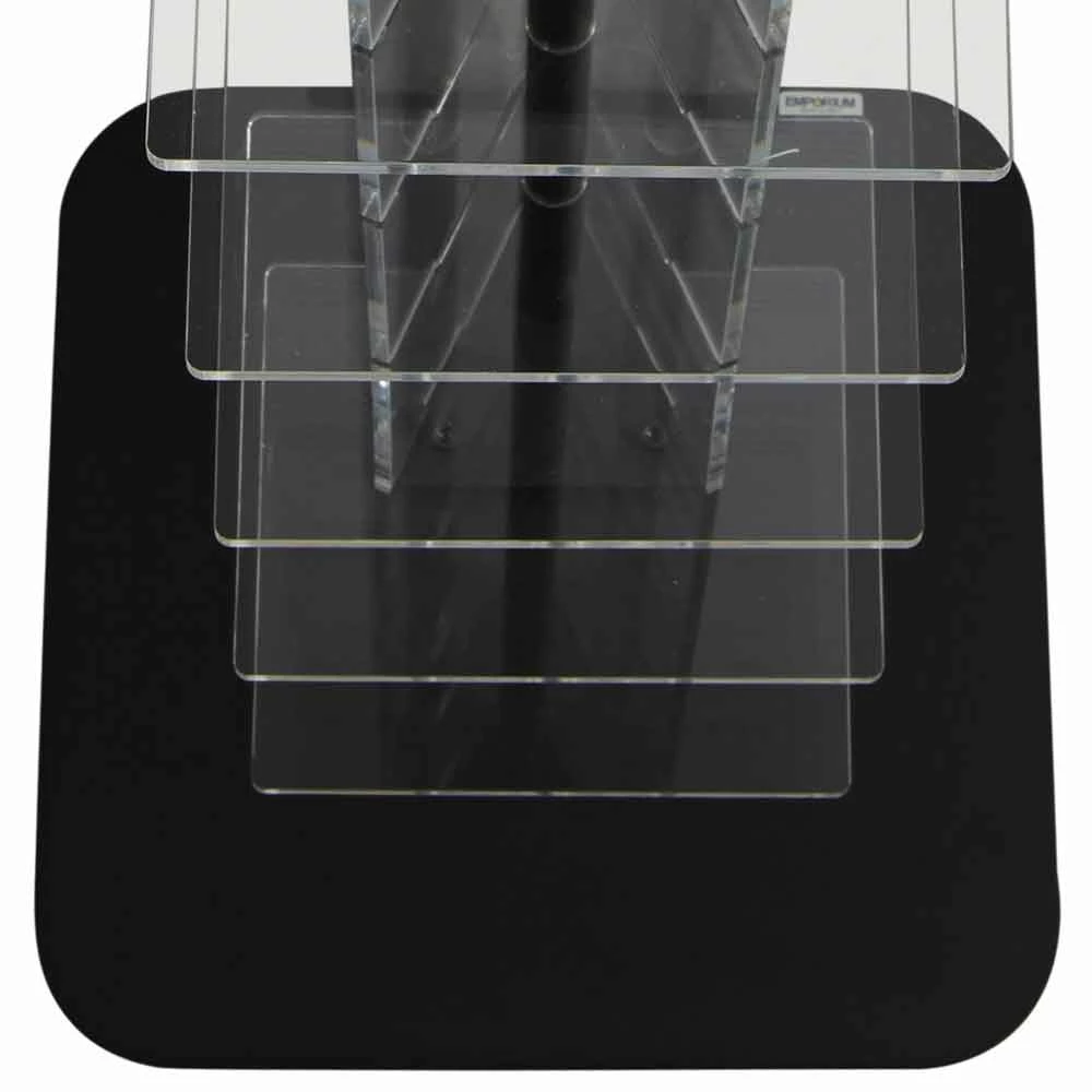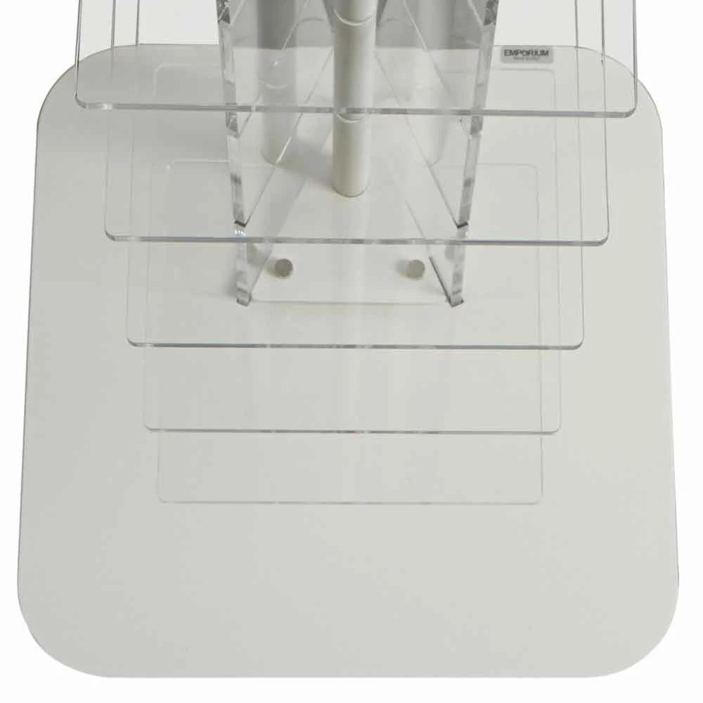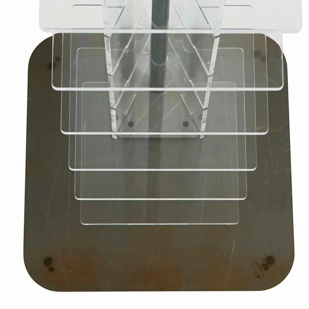 Bibliotheek: lichaam en planken in transparante 6 mm dik methacrylaat. Base en pole verkrijgbaar in de volgende uitvoeringen: natuurlijke metaal, geschilderd zwart en wit. Voeten in zwart kunststof. Op verzoek satijn methacrylaat planken.