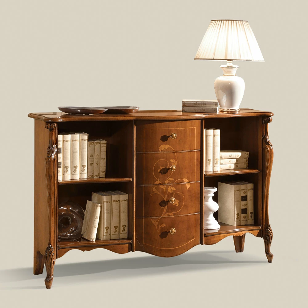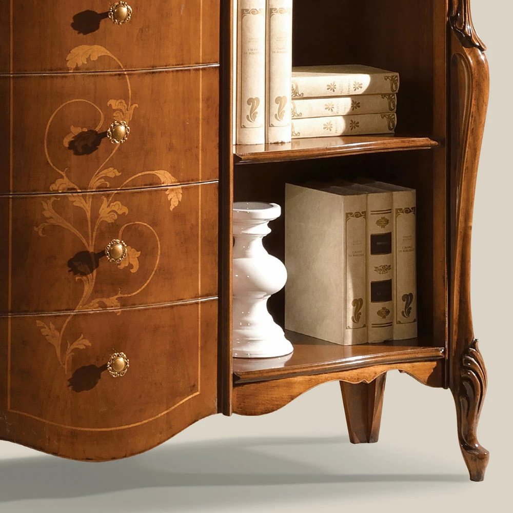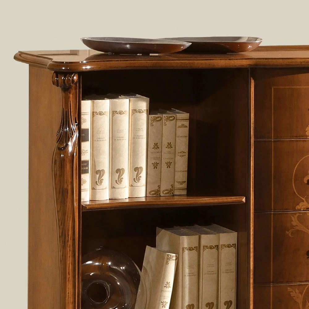 Boekenkast in klassieke stijl , perfect voor het inrichten van een woonkamer, een studeerkamer of een slaapkamer met stijl en elegantie. Het is gemaakt van Bassano-notenhout met elegante inleg en heeft 4 praktische lades en compartimenten. Een unieke en verfijnde aanvulling, volledig gemaakt in Italië door bekwame meesters , meesters van kunst die elke aanvulling afwerken met wijsheid en smaak voor elegantie. De productie wordt uitgevoerd met behulp van fijne materialen en het werk wordt met de hand uitgevoerd met de grootste zorg en professionaliteit die Made in Italy- producten onderscheidt.