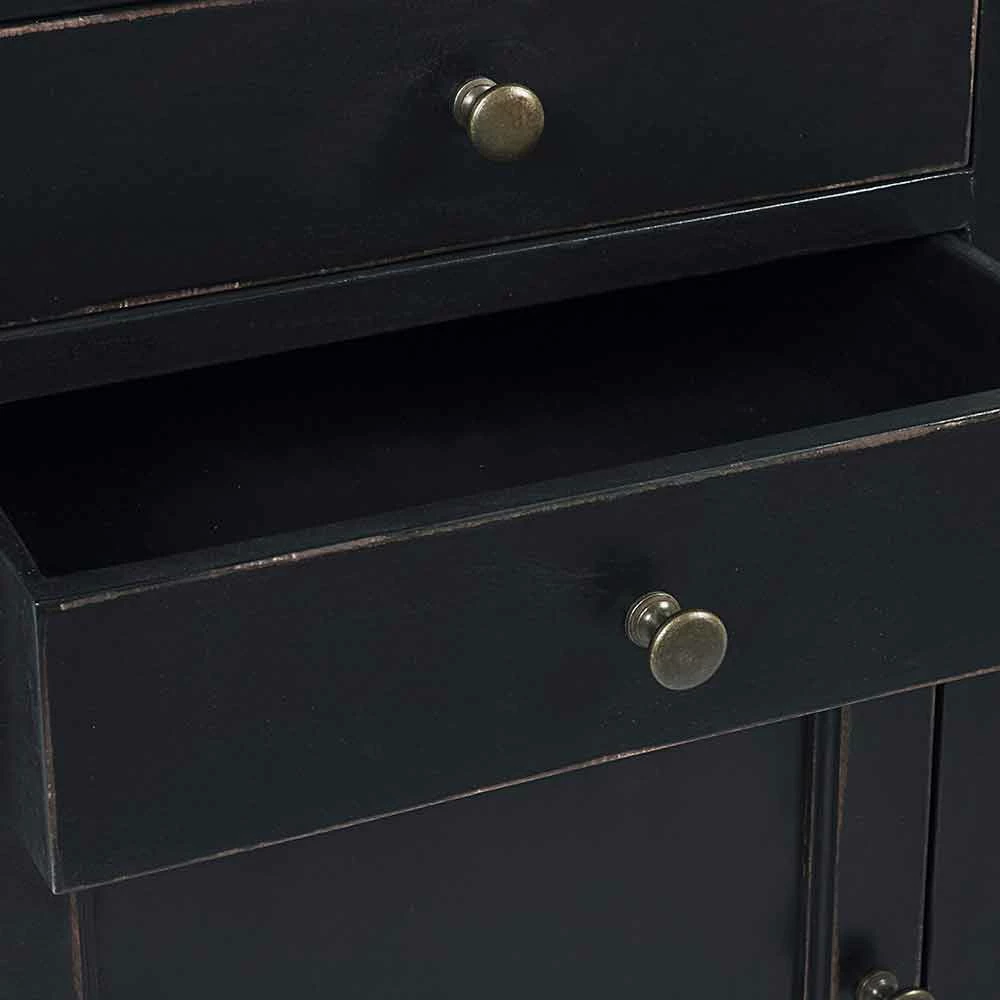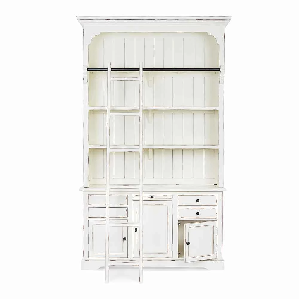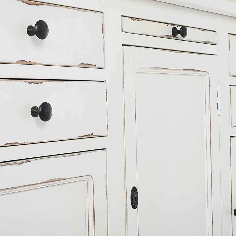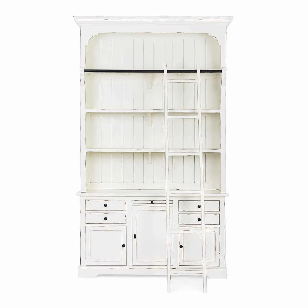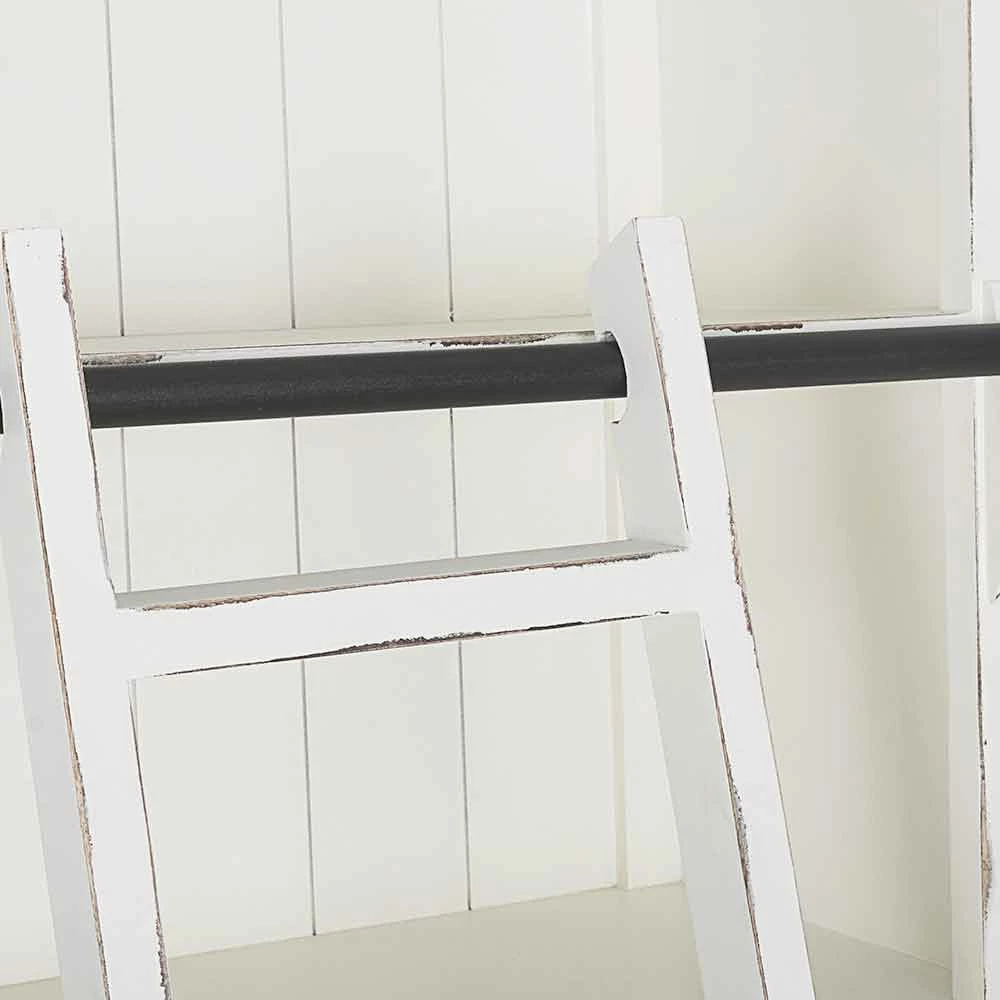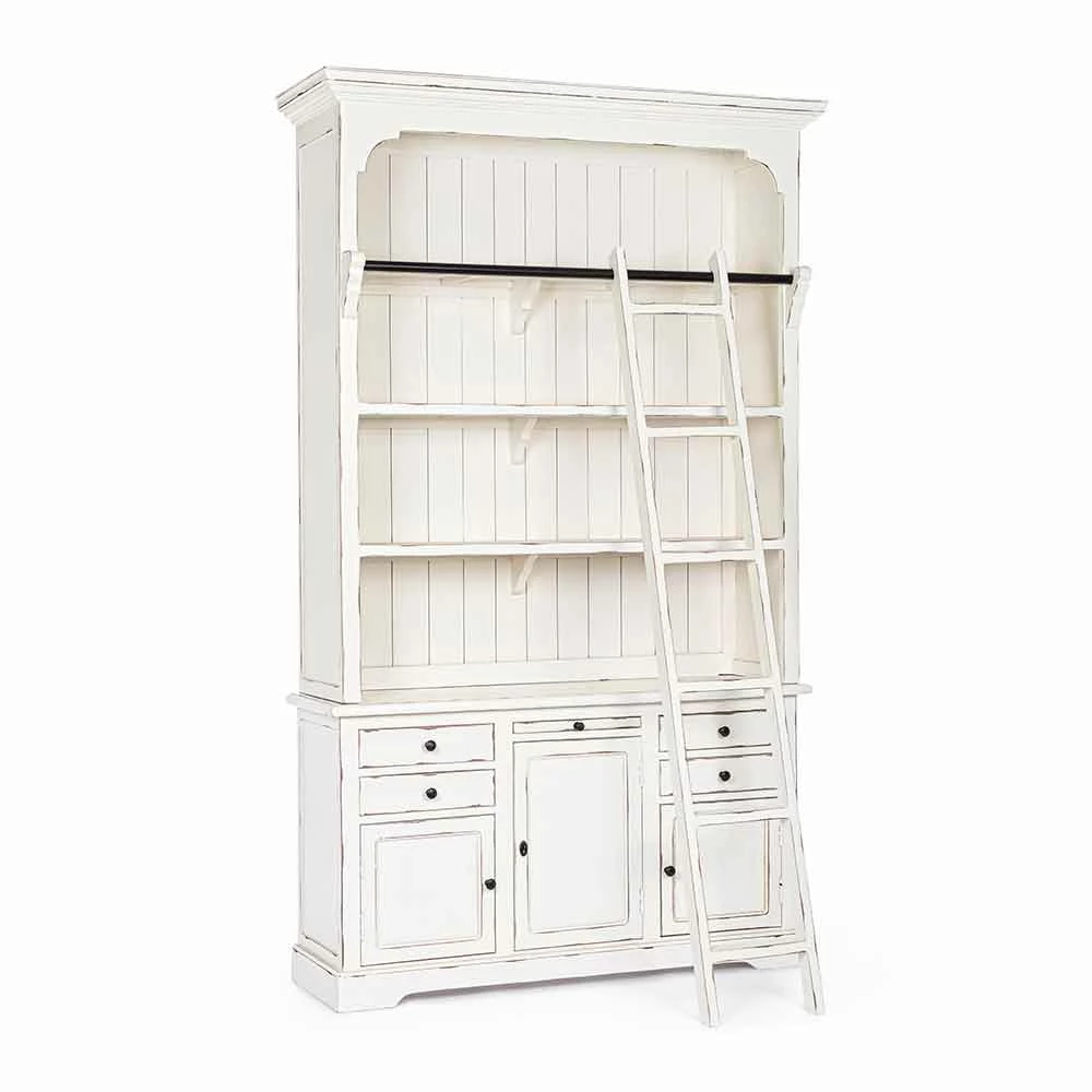 Structuur in mangohout , achterkant en zijkanten in mdf . Decoratieve ladder van mangohout. Ingelegde en verweerde afwerking op basis van nitrocellulose. Gietijzeren handvatten.