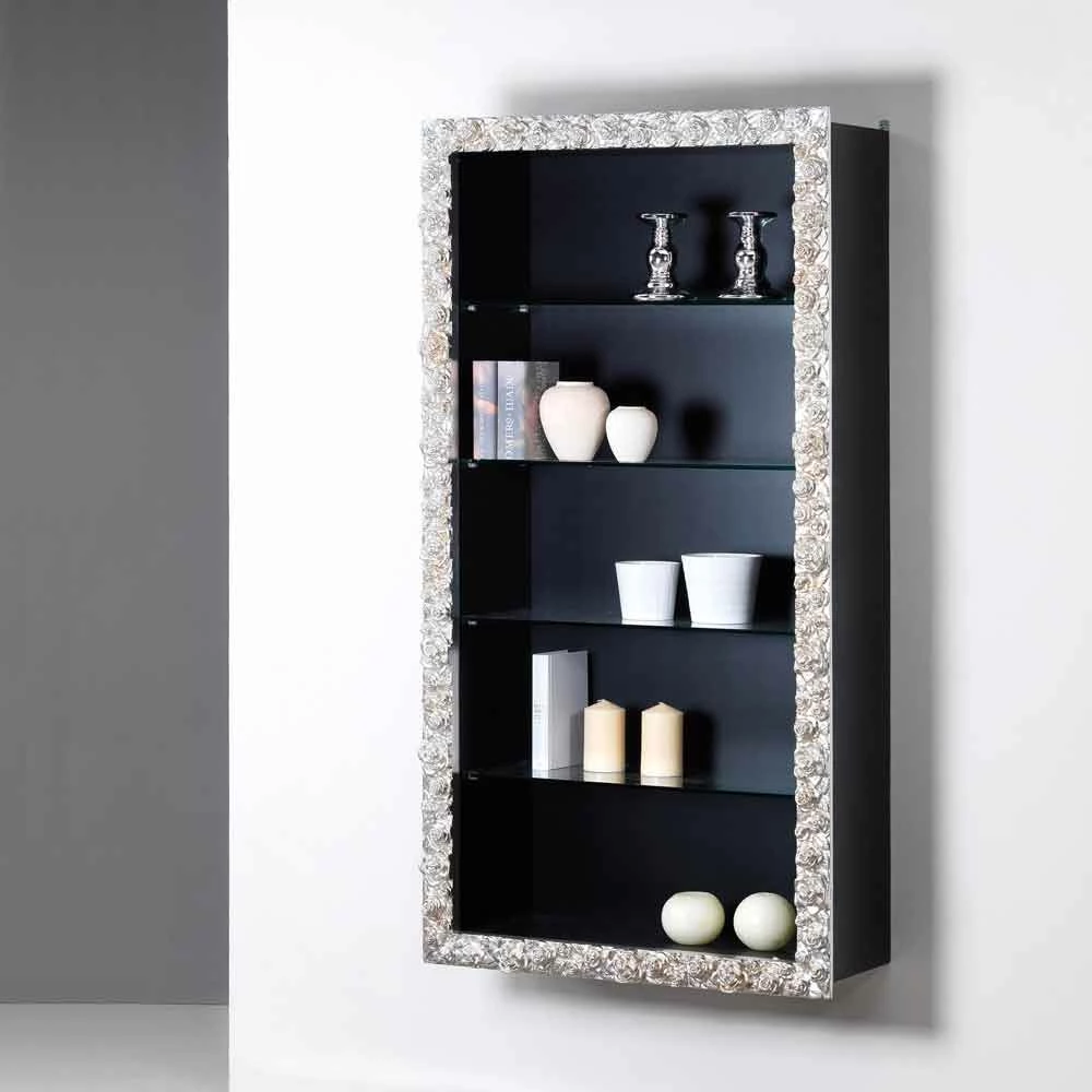 Bibliotheek met houten structuur meubelplaat gefineerd en glazen planken. Frame versierd met rozen met zilveren blad afwerking. zwart gelakt frame. Met de hand bewerkt, gemaakt in Italië.