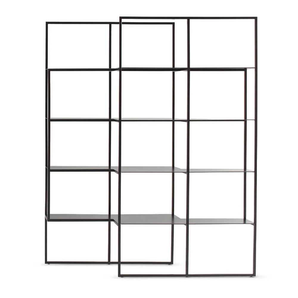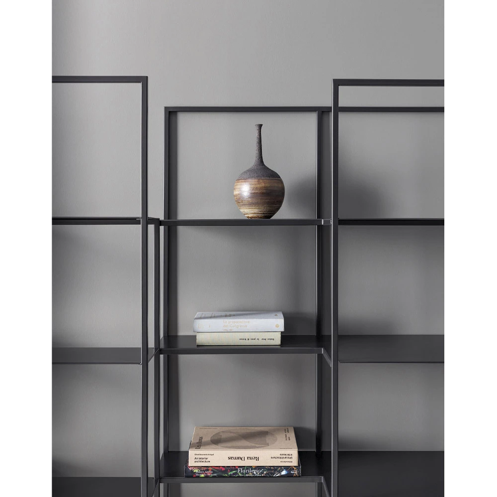 Wandboekenkast met metalen structuur en planken, gemaakt in Italië met hoogwaardige grondstoffen . Een origineel idee dat speelt met perspectief en met de verschillende optische effecten voor een resultaat dat een vaardige constructieve vaardigheid tot uitdrukking brengt. Het figuur bestaat uit twee dragende frames die een creatief en veelzijdig systeem van verspringende planken creëren. In het midden van de structuur worden de planken breder om ruimte te geven aan objecten van belangrijke afmetingen, terwijl de zijplanken lichter zijn en zich ontwikkelen op een “vrijdragende” figuur. De twee verschoven elementen geven het product een fascinerend 3D-effect en bieden de mogelijkheid om verschillende configuraties binnen de ruimte te creëren voor een exclusief en avant-gardistisch resultaat .