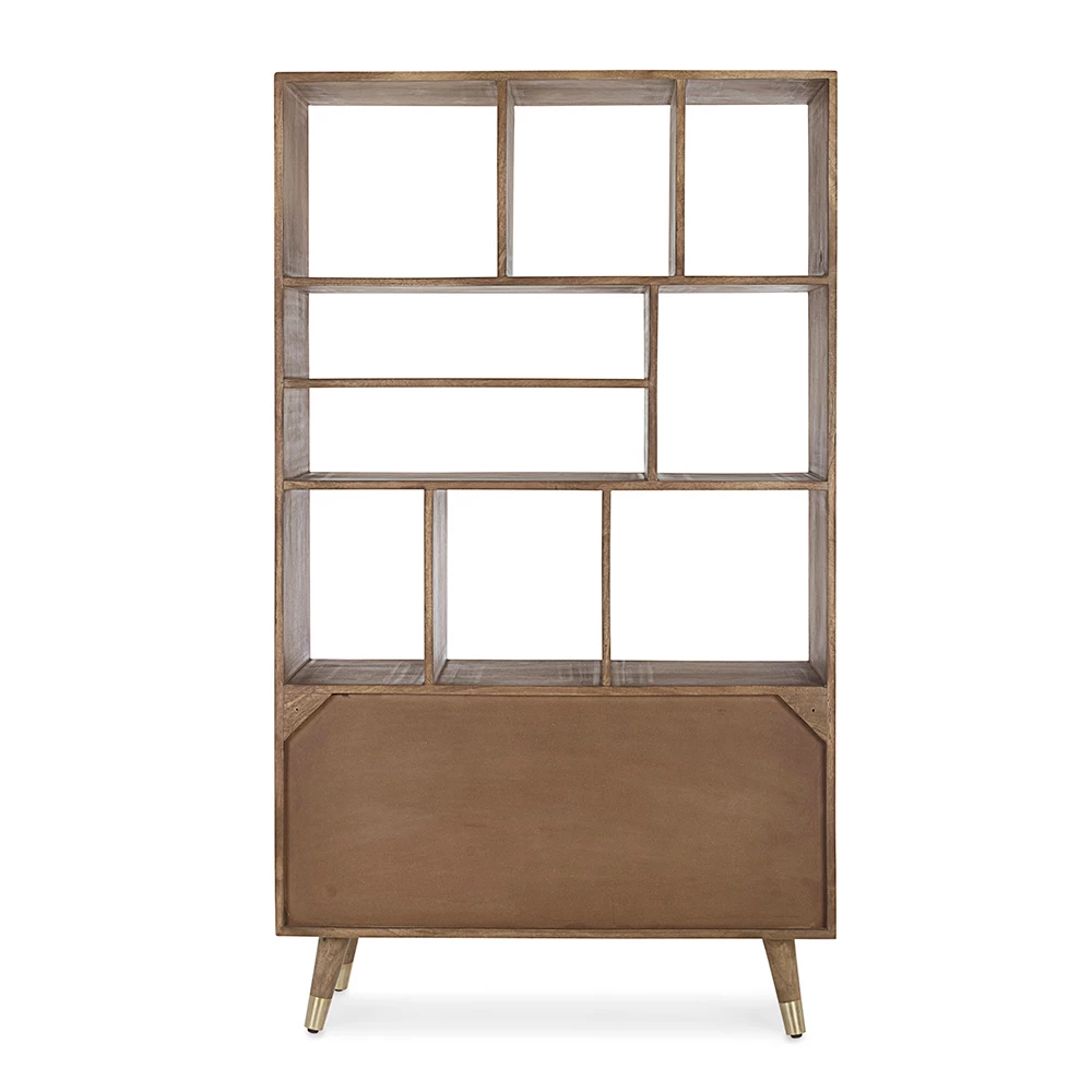 Vrijstaande boekenkast in mangohout met gerecyclede deuren en stalen handgrepen.