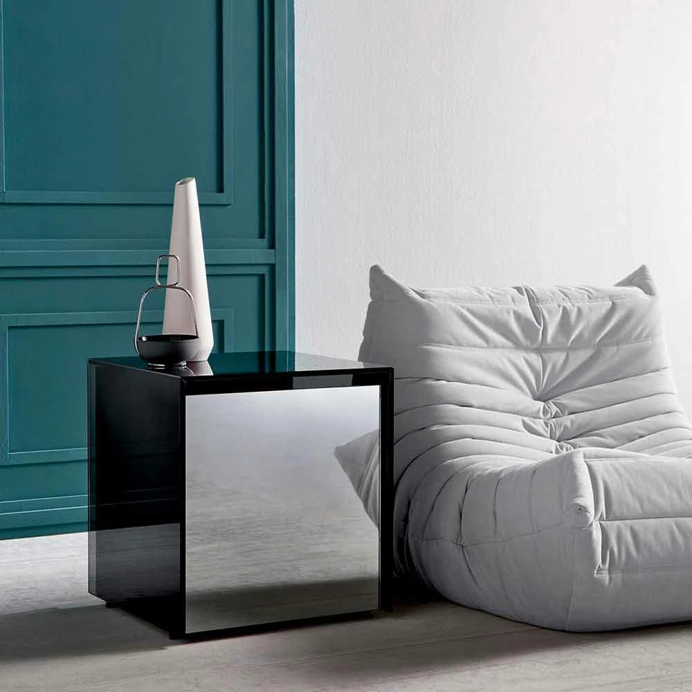 De eigenaardigheid wordt gegeven door het rookglas waarmee het is gemaakt, gebruikt voor de externe structuur, terwijl het “ik zie, ik zie niet”-effect van de interne lade in zwart hout een verfijnde en elegante constructie creëert.