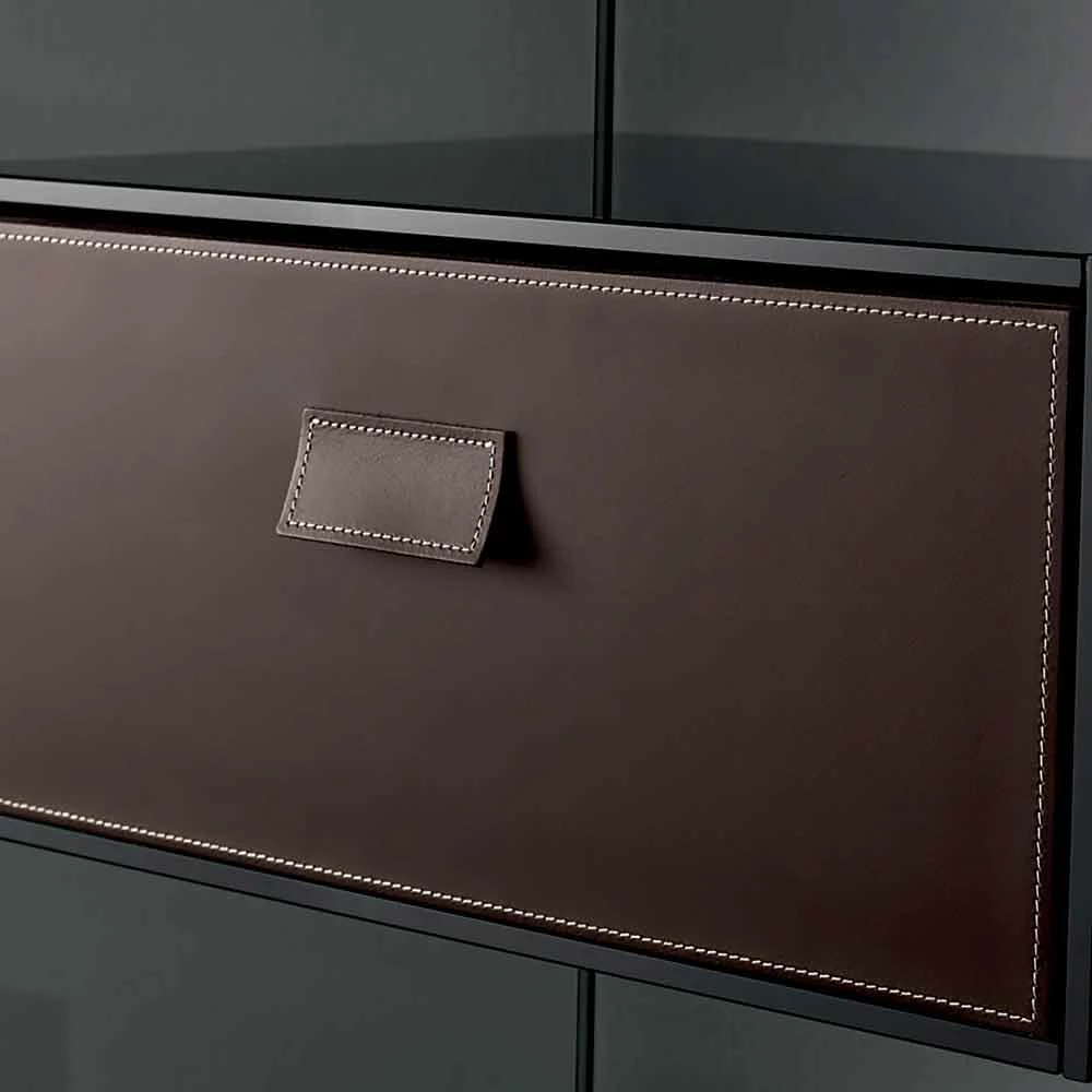 Nachtkastje in gerookt glas met spiegelvoet en lederen lade gemaakt in Italië.