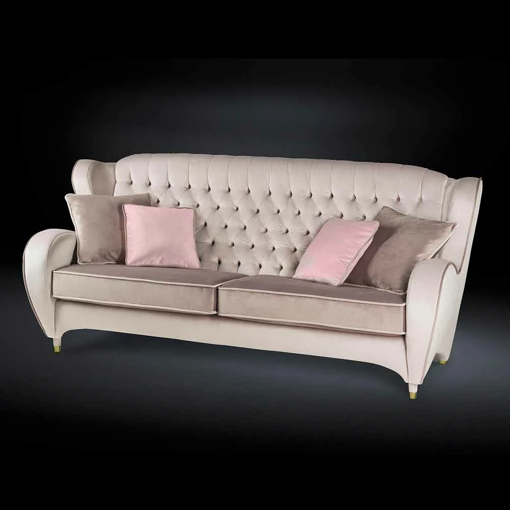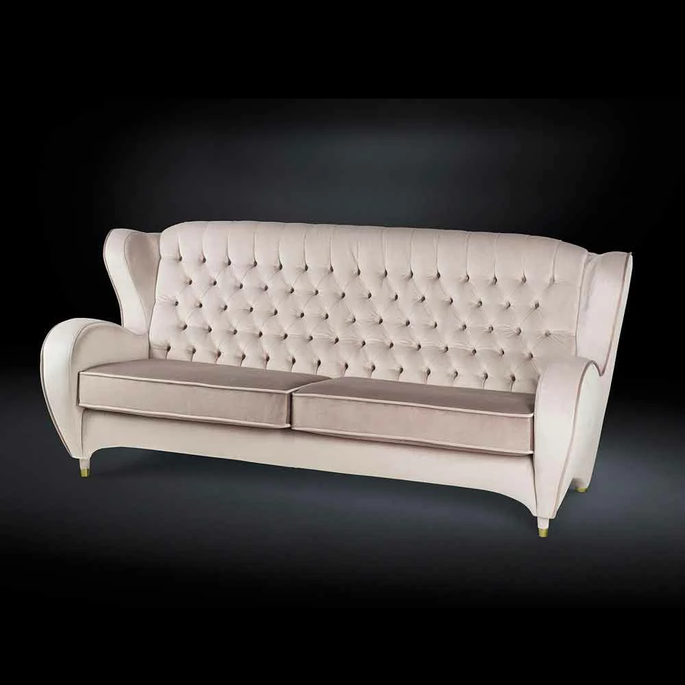 De bijzonderheid van deze bank is ingekapseld in zijn kostbare coating glad en zacht fluweel, uit fijne nuances ecru Tortora rand en dakgoot. New Classic stijl bank met hoge rug in capitonnè.