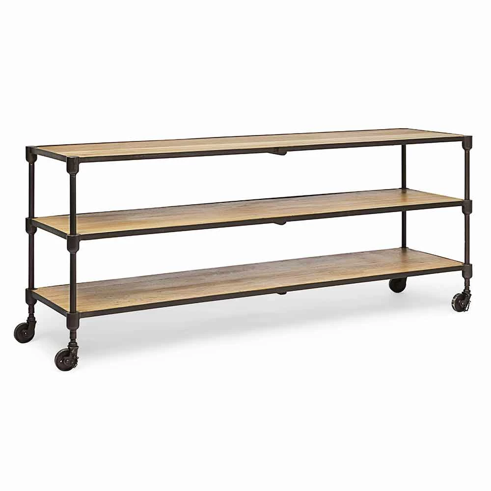 Tv-meubel met stalen structuur en teakhouten bladen.
