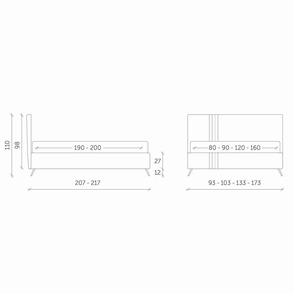 Het hoofdbord en het bedframe worden gekruist door twee verticale en parallelle strepen in Stella Tex-stof, kleuren 1 en 2. Het hoofdbord is niet verwijderbaar, het bedframe is verwijderbaar.
