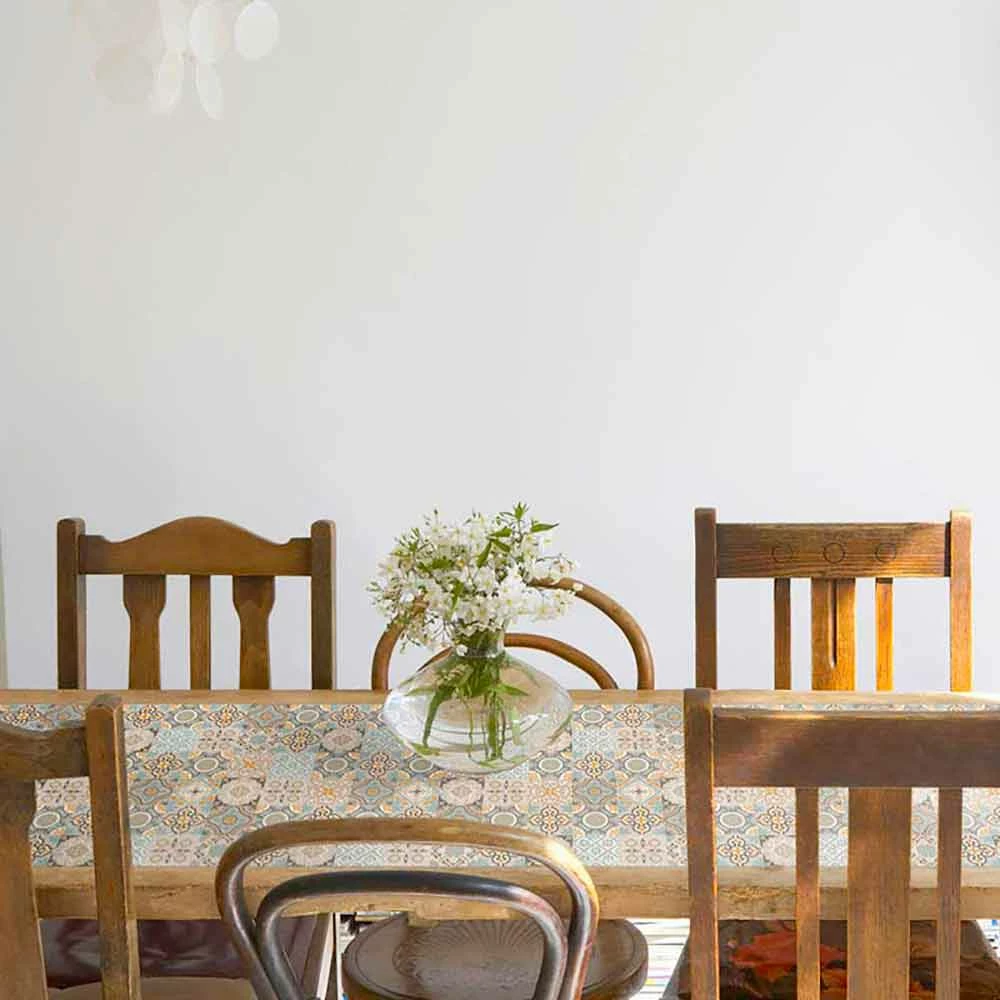 Deze tafelloper is ongetwijfeld de ideale oplossing voor wie op zoek is naar een product dat een snelle en functionele opstelling van de tafel mogelijk maakt zonder ooit het esthetische en decoratieve aspect te verwaarlozen. Dankzij de materialen waarvan het is gemaakt, kan dit product zowel binnen als buiten worden geplaatst, terwijl direct contact met de zon wordt vermeden. Het is ook uitstekend bestand tegen slijtage na verloop van tijd en ondoordringbaar voor vlekken, aangezien het geen vezels heeft die vloeistoffen of andere stoffen zoals klassieke stoffen tafelkleden kunnen absorberen. Dit laatste heeft ook te maken met de eenvoud van het reinigen van het product, waarvoor een vochtige doek voldoende is.