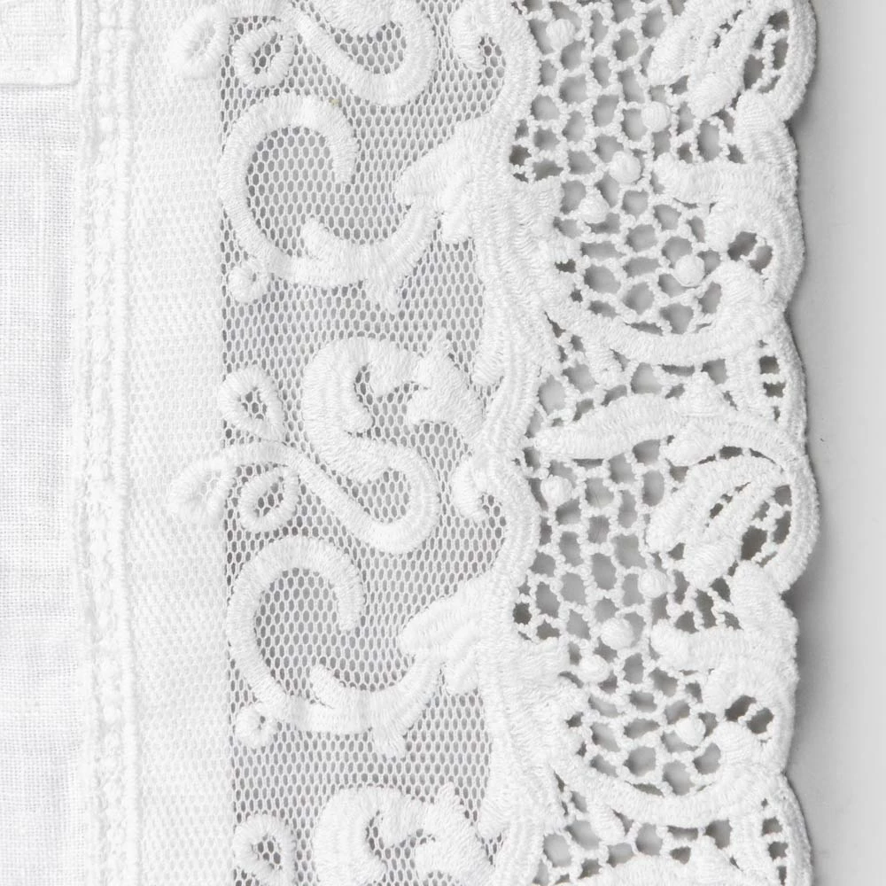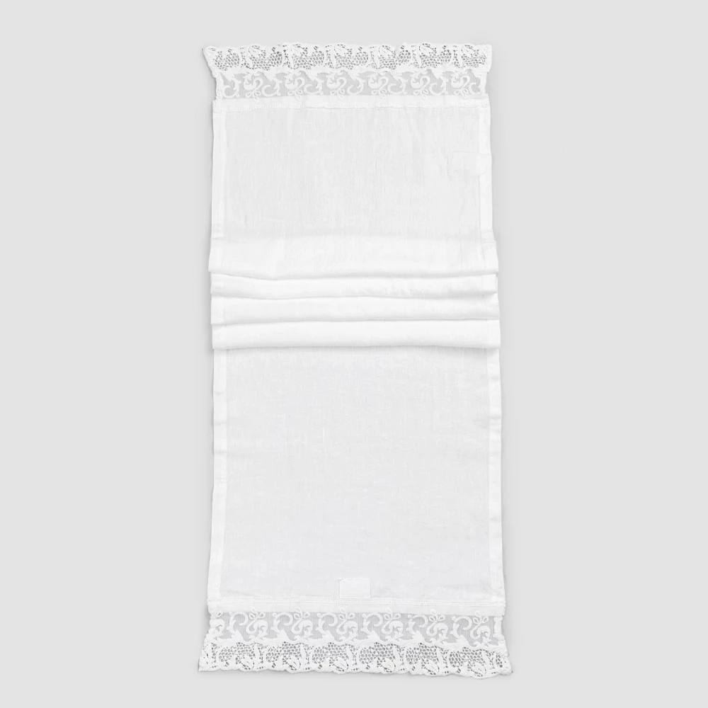 Witte linnen tafelloper met tule kant en omgeslagen rand, luxe design made in Italy.